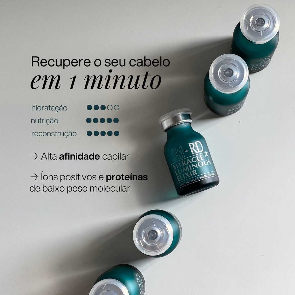 SH-RD Miracle Luminous Elixir - Ampola de Tratamento 10ml Para todos os tipos de cabelo, em especial os desvitalizados, opacos e quebradiços. Proporciona um tratamento eficaz de 1 minuto contra frizz, quebra, opacidade e ressecamento dos fios. Sua fórmula multifuncional tem como principal foco reparar, hidratar, dar brilho, maciez e disciplinar os fios através de seus ingredientes de alta performance. Conselho de Aplicação Aplique nos cabelos mecha por mecha, massageando suavemente do meio para as pontas. Deixe agir por um minuto. Enxágue.