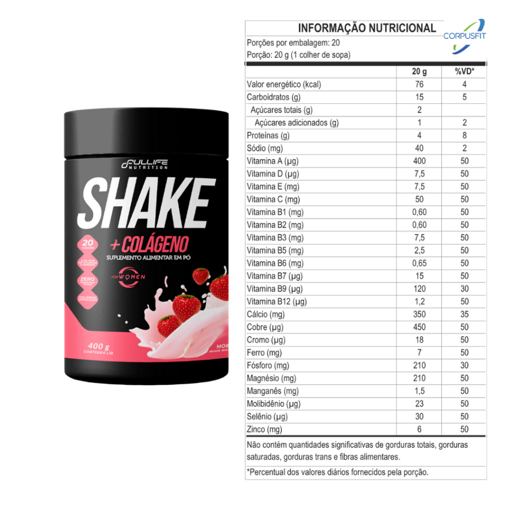 Com uma fórmula completa e exclusiva, Shake for Women foi desenvolvido para garantir uma redução de peso de forma saudável e com qualidade nutricional. Sua fórmula contém colágeno hidrolisado, que atua fortalecendo a elasticidade da pele durante o processo de emagrecimento, vitaminas e minerais que são essenciais para o bom funcionamento do corpo humano. Apresentação: 400g MORANGO – CHOCOLATE - BAUNILHA PREPARO DO PRODUTO Adicione 1 colher de sopa cheia (aprox. 25g) do Shake em um copo grande (250ml) de leite desnatado e bata no liquidificador ou na sua coqueteleira por cerca de 15 segundos. Consuma logo após o preparo. AO DOSAR O PRODUTO, SEMPRE UTILIZE UTENSÍLIOS SECOS. SUGESTÃO DE USO Substitua até duas refeições diárias de sua preferência ou conforme orientação do nutricionista ou médico. RECOMENDAÇÕES “Dietas de controle ou redução de peso requerem reeducação dos hábitos alimentares e prática de atividade física orientada por especialistas.” “Este produto não substitui uma alimentação equilibrada e seu consumo deve ser orientado por nutricionista ou médico.” “Este produto não deve ser consumido por crianças, gestantes, idosos e portadores de enfermidades.” “Diabéticos, contém sacarose, maltose e lactose. Presentes naturalmente nas matérias primas.” “Este não é um produto com valor energético reduzido.” “Conservar este produto bem fechado em lugar fresco, seco e protegido dos raios solares.” “Depois de aberto, consumir preferencialmente em até 30 dias.” “Produto isento de registro de acordo com a RDC 27, de 6 de agosto de 2010.” INGREDIENTES: MORANGO: Maltodextrina, proteína concentrada do soro do leite, proteína da soja, colágeno hidrolisado, antiumectante fosfato tricálcico, magnésio, cálcio, fósforo, molibdênio, vitamina C, vitamina B3, ferro, vitamina E, zinco, vitamina B5, manganês, vitamina B2, vitamina B1, vitamina B6, cobre, vitamina A, vitamina B9, cromo, selênio, vitamina H, vitamina D, vitamina B12, goma xantana, aroma sintético idêntico ao natural de morango, edulcorantes sucralose, acessulfame de potássio e corante vermelho bordeaux. NÃO CONTÉM GLÚTEN. CHOCOLATE: Maltodextrina, proteína concentrada do soro do leite, proteína da soja, cacau em pó, colágeno hidrolisado, antiumectante fosfato tricálcico, magnésio, cálcio, fósforo, molibdênio, vitamina C, vitamina B3, ferro, vitamina E, zinco, vitamina B5, manganês, vitamina B2, vitamina B1, vitamina B6, cobre, vitamina A, vitamina B9, cromo, selênio, vitamina H, vitamina D, vitamina B12, goma xantana, aroma sintético idêntico ao natural de chocolate, edulcorantes sucralose e acessulfame de potássio. NÃO CONTÉM GLÚTEN. BAUNILHA: Maltodextrina, proteína concentrada do soro do leite, proteína da soja, colágeno hidrolisado, antiumectante fosfato tricálcico, magnésio, cálcio, fósforo, molibdênio, vitamina C, vitamina B3, ferro, vitamina E, zinco, vitamina B5, manganês, vitamina B2, vitamina B1, vitamina B6, cobre, vitamina A, vitamina B9, cromo, selênio, vitamina H, vitamina D, vitamina B12, goma xantana, aroma sintético idêntico ao natural de morango, edulcorantes sucralose, acessulfame de