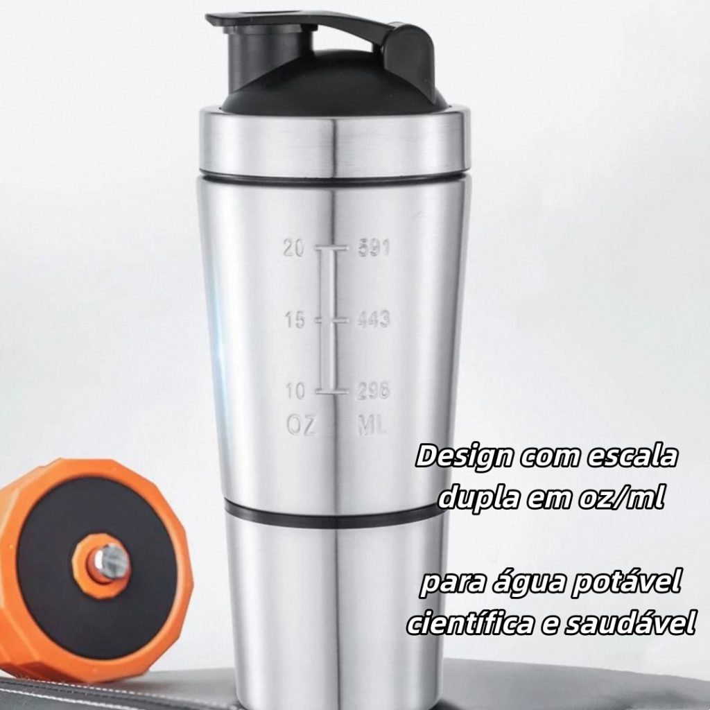 Shakeira Dupla Inox 750ml Coqueteleira Academia Misturador com Compartimento e Shaker Ball em Inox