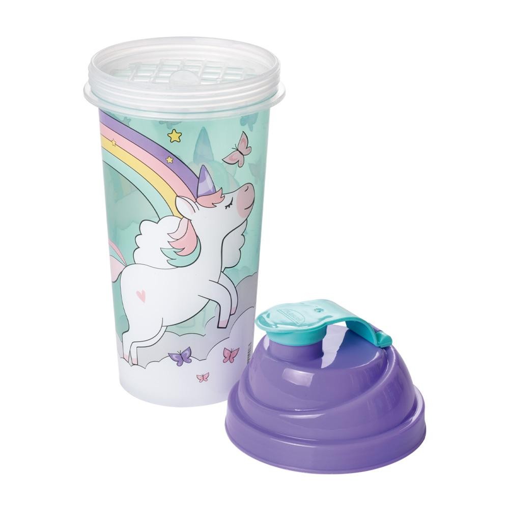 Shakeira Garrafa Unicórnio 580 ml Infantil Plasútil Dimensao: (Diâmetro x Alt): 9,5x20,7 cm Capacidade: 580,0 ml - A shakeira de 580 ml é perfeita para shakes ou bebidas que necessitem de agitação para dar cremosidade. Possui tampa com fechamento rosca (que dá mais segurança) e sobretampa encaixável que facilita abertura no momento da refeição ou hidratação. Acompanha também gradinha e misturador. - Fabricado em plástico polipropileno (PP). Atóxico e livre de bisfenol-A (BPA FREE). - Pode ser levado ao micro-ondas e freezer..