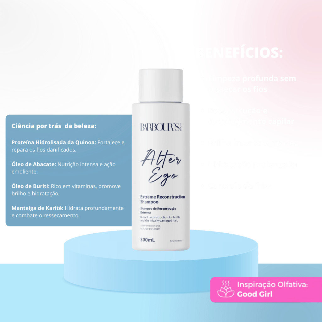 SOBRE O PRODUTO: O Shampoo Reconstrutor Alter Ego da Barbour's Beauty foi desenvolvido para proporcionar uma limpeza profunda e delicada, enquanto restaura a fibra capilar. Sua fórmula enriquecida com ativos nutritivos e reparadores age diretamente nos fios, devolvendo a maciez, o brilho e a vitalidade. Ideal para cabelos danificados e ressecados, promove um cuidado completo desde a lavagem, preparando os fios para a reconstrução capilar. INDICAÇÃO: Indicado para cabelos danificados, ressecados e que precisam de reconstrução e hidratação intensa. A CIÊNCIA POR TRÁS DA BELEZA: Proteína Hidrolisada da Quinoa: Fortalece e repara os fios danificados. Óleo de Abacate: Nutrição intensa e ação emoliente. Óleo de Buriti: Rico em vitaminas, promove brilho e hidratação. Manteiga de Karité: Hidrata profundamente e combate o ressecamento. BENEFÍCIOS: Limpeza profunda sem ressecar os fios Reconstrução e fortalecimento capilar Brilho intenso e maciez Hidratação prolongada Controle do frizz MODO DE USO: Aplique o shampoo nos cabelos molhados, massageando suavemente o couro cabeludo até formar espuma. Enxágue e, se necessário, repita a aplicação. Para melhores resultados, utilize o Condicionador Alter Ego em seguida. RESULTADOS: Cabelos profundamente limpos, hidratados e com fios restaurados desde a primeira lavagem. NOTAS DA FRAGRÂNCIA: Fragancia suave inspirada no Good Girl** COMPOSIÇÃO: Água, Lauryl Eter Sulfato De Sódio, Dietanolamida Do Ácido Graxo De Coco, Betaína De Coco, Perfume,Diestearato De Etilenoglicol, Lauril Sulfato De Amônio, Diestearato De Peg 150, Ácido Lático, Goma Guar Quaternizada, Peg-40 / Ppg-8 Metil Amino Propil/Hidro Propil Dimeticone Copolímero, EDTA Dissódico, Óleo De Macadâmia, Colágeno Hidrolisado,Metil Cloro Isotiazolinona,Metil Isotizolinona, Benzoato De Benzila, Salicilato De Benzila, Citronelol, Cumarina, Limoneno, Gerânio, Aldeido Hexil Cinamico, Hidroxicitronelal, Isoeugenol, Linalol. **Nota de Esclarecimento sobre Referências Olfativas - Barbour's Beauty Na Barbour's Beauty, desenvolvemos produtos com inspirações olfativas únicas, criados para proporcionar experiências sensoriais distintas e enriquecedoras aos nossos clientes. É importante ressaltar que qualquer menção a outras marcas ou produtos em nossas comunicações visa exclusivamente oferecer uma referência olfativa que facilite a identificação das características aromáticas de nossos produtos. Esclarecimentos Importantes: Independência da Marca: A Barbour's Beauty não possui vínculos com quaisquer outras marcas ou produtos mencionados. As referências são utilizadas estritamente para fins de contextualização olfativa. Propriedade das Marcas: Todas as marcas ou produtos mencionados pertencem a seus respectivos fabricantes e desenvolvedores. Uso de Referências: O uso de descrições olfativas similares é uma ferramenta para enriquecer a experiência do consumidor, oferecendo uma noção preliminar dos aromas, sem sugerir similitude completa com produtos de outras marcas. Inspiração Criativa: A menção de ""inspiração olfativa"" não constitui promessa de resultados idênticos ou similares aos de outros produtos no mercado. Cada composição olfativa da Barbour's Beauty é uma criação exclusiva, com direção artística própria. Compromisso com a Qualidade e Transparência: Na Barbour's Beauty, estamos comprometidos em oferecer produtos de alta qualidade, com fragrâncias exclusivas que verdadeiramente capturam a essência de nossa marca. Nosso objetivo é sempre assegurar transparência e clareza para nossos clientes, garantindo uma experiência de compra autêntica e satisfatória.