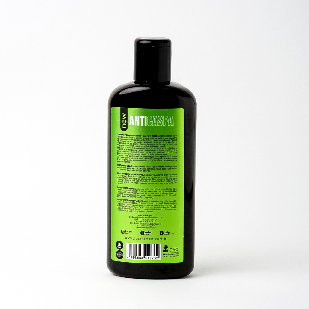 O SHAMPOO ANTICASPA FOX FOR MEN combate a caspa sem danificar os fios. Além de eliminar a caspa, controla a oleosidade e contém agentes que previnem a proliferação de fungos no couro cabeludo. Auxilia no tratamento da dermatite, aliviando sintomas e evitando o reaparecimento da caspa. Dermatologicamente testado e livre de propriedades irritantes, possui laudo de eficácia comprovado. Sua fórmula reduz a descamação, alivia a coceira e a vermelhidão, e reequilibra o microbioma capilar, proporcionando alívio imediato. Um couro cabeludo saudável é essencial para o crescimento dos fios, e qualquer desequilíbrio no microbioma pode resultar em caspa. A caspa pode causar coceira e descamação, o que pode danificar os folículos capilares e levar à queda de cabelo. Começar o tratamento cedo é crucial para evitar o afinamento capilar e promover um crescimento saudável dos fios. MODO DE USAR: Aplique sobre os cabelos molhados massageando suavemente. Deixe agir por 3 minutos e enxágue. Utilize duas a três vezes por semana. Evite o contato com os olhos. PRECAUÇÕES: Uso externo. Não ingerir. Mantenha fora do alcance de crianças. Evite o contato com os olhos; se ocorrer, enxágue imediatamente com água em abundância. Não misture o produto com outros produtos. Após o uso, mantenha a embalagem bem fechada. Em caso de irritação ou reação adversa, interrompa o uso e consulte um médico. COMPOSIÇÃO INCI: aqua, guar hydroxypropyltrimonium chloride, edta disodium, sodium laureth-2 sulfate, cocamide dea, cocamidopropyl betaine, ci 77289, ci 42051, zinc pyrithione, salicylic acid, charcoal powder, glycerin, phenoxyethanol, propylene glycol, polyquaternium 7, citric acid, glycol distearate, menthol, parfum (fragrance). COMPOSIÇÃO PORTUGUES: Água, Cloreto De Guar Hidroxipropiltrimônio, Edetato Dissódico, Sulfato De Sódio Laurete-2, Dietanolamina Cocamida, Cocamidopropil Betaína, Corante Verde 77289, Corante Azul Merantina 42051, Piritiona De Zinco, Ácido Salicílico, Pó De Carvão, Glicerol, Fenoxietanol, Propileno Glicol, Poliquatérnio 7, Ácido Cítrico, Diestearato De Etilenoglicol, Mentol, Perfume. Evolução Química de Cosméticos LTDA CNPJ: 31.904.225/0001-04 TEC: CRQ 04474224 Processo da Anvisa: 25351.495857/2022-61 Aut Func: 4.01.904-3 Industria Brasileira