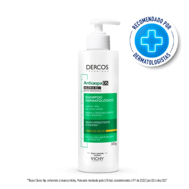 O que é o Shampoo Anticaspa Vichy Dercos DS Para Cabelos Secos? O Shampoo Anticaspa Vichy Dercos DS é um cuidado para o couro cabeludo com tendência à caspa, desenvolvido para cabelos secos. Sua fórmula com tecnologia de Microbioma e Selênio DS ajuda a reequilibrar o couro cabeludo e oferece alívio da coceira e do desconforto desde a primeira aplicação. Para que serve o Shampoo Anticaspa Vichy Dercos DS Para Cabelos Secos? Serve para controlar a caspa visível e aliviar a coceira do couro cabeludo seco. Segundo o fabricante, elimina 100% das caspas visíveis desde a primeira aplicação e ajuda a prevenir o reaparecimento por até 6 semanas, quando usado conforme orientação. Composição do Shampoo Anticaspa Vichy Dercos DS Para Cabelos Secos Tecnologia de Microbioma Selênio DS Fórmula dermatologicamente testada Benefícios do Shampoo Anticaspa Vichy Dercos DS Para Cabelos Secos Ajuda a eliminar 100% das caspas visíveis desde a 1ª aplicação* Auxilia na prevenção do reaparecimento por até 6 semanas* Alívio da coceira e do desconforto no couro cabeludo Sensação de refrescância imediata e duradoura Formulado para cabelos secos, com foco em reequilíbrio do couro cabeludo *Conforme informações do fabricante, quando utilizado conforme modo de uso. Modo de uso do Shampoo Anticaspa Vichy Dercos DS Para Cabelos Secos Aplique o shampoo no couro cabeludo e nos cabelos úmidos, massageando suavemente. Deixe agir por 2 minutos e enxágue abundantemente. Utilize conforme a necessidade do seu couro cabeludo ou orientação do fabricante. Advertências ao uso do Shampoo Anticaspa Vichy Dercos DS Para Cabelos Secos Uso externo. Evite contato com os olhos; em caso de contato, enxágue abundantemente. Não usar em couro cabeludo lesionado ou irritado. Mantenha fora do alcance de crianças. Em caso de sensibilidade, suspenda o uso e procure orientação profissional. Tamanho do produto Frasco com 300ml.