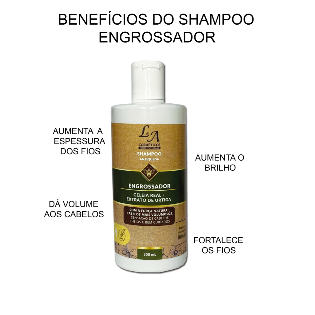 Conteudo : 01 shampoo antiqueda e engrossador 300 ml O shampoo antiqueda engrossador é indicados para cabelos finos e frageis , formulado para reduzir a queda capilar , ele oferece maior volume e uma textura mais densa , fortalecida e saudavel . Com a combinação de geleia real e extrato de urtiga , seus ingredientes atuam desde a raiz , promovendo fios mais fortes e resistentes . Benefícios: - Proporciona um aumento na espessura dos fios, fortalece e revitaliza o couro cabeludo; - Além disso, devolve o brilho e a força dos cabelos opacos e quebradiços. Modo de usar: 1) Aplique sobre o cabelo molhado, distribuindo generosamente, fazendo uma leve massagem no couro cabeludo; 2) Enxágue e repita a operação.