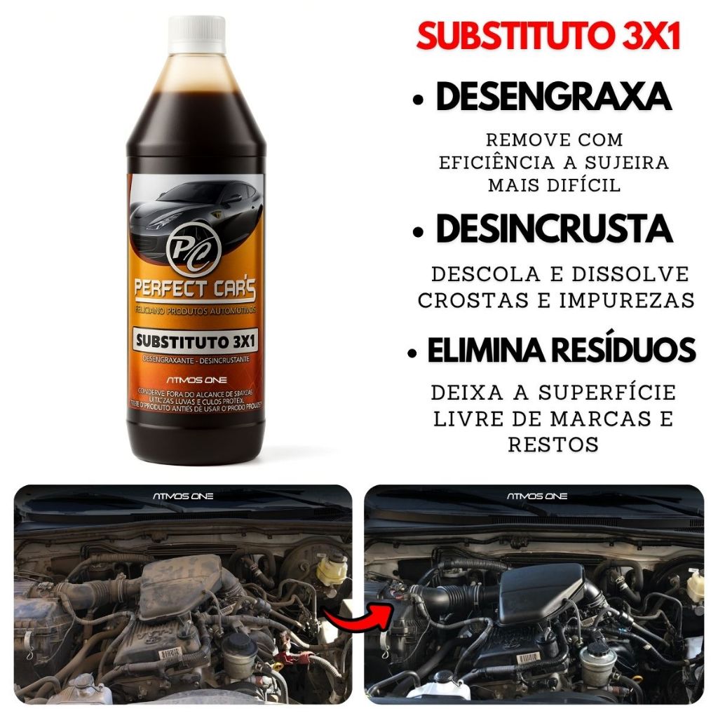 LAVE SEU CARRO EM CASA COM EFICIÊNCIA PROFISSIONAL Mais praticidade, menos esforço e economia real na hora da limpeza. Se você está cansado de perder tempo lavando o carro e usando vários produtos diferentes, o Perfect Car’s – Substituto 3x1 é a solução ideal para a sua rotina. Com uma fórmula SUPER CONCENTRADA e de alto desempenho, ele remove sujeira pesada, graxa e resíduos com rapidez e eficácia, sem necessidade de esfregar excessivamente ou gastar litros de água. POR QUE ESCOLHER O PERFECT CAR’S – SUBSTITUTO 3X1? Alto rendimento: 1 litro do produto rende até 59 litros de solução. Praticidade total: APENAS UM PRODUTO com função de TRÊS: desengraxar, desincrustar e limpar - 3 em 1! Mais economia: Reduz o consumo de água e o tempo de limpeza Versatilidade: Ideal para qualquer tipo de veículo. INDICADO PARA: Lavagem de chassis, carrocerias de madeira, motores, rodas e pneus. Perfeito para uso em carros, motos e caminhões. COMO USAR O PRODUTO Diluição recomendada: Limpeza pesada: 53 ml do produto para 1 litro de água Limpeza média: 34 ml do produto para 1 litro de água Limpeza leve: 17 ml do produto para 1 litro de água Aplicação: Dilua o produto conforme o nível de sujeira Aplique com pulverizador ou borrifador Aguarde alguns instantes para o produto agir Enxágue com água Importante: NÃO DEIXE O PRODUTO SECAR SOBRE A PINTURA!! ORIENTAÇÕES IMPORTANTES Para rodas com pinturas sensíveis ou personalizadas, recomenda-se realizar um teste prévio em uma pequena área antes da aplicação total. Ajuste a diluição conforme necessário para obter o melhor resultado sem danificar superfícies. GARANTIA O fabricante não se responsabiliza por danos causados pelo uso inadequado ou fora das recomendações indicadas. CONTEÚDO DA EMBALAGEM 1 unidade de Perfect Car’s Substituto 3x1 – 1 Litro Produto biodegradável Transforme a forma como você cuida do seu veículo. Com o Perfect Car’s, sua garagem vira um centro de estética automotiva. Economia, praticidade e resultado profissional ao seu alcance.