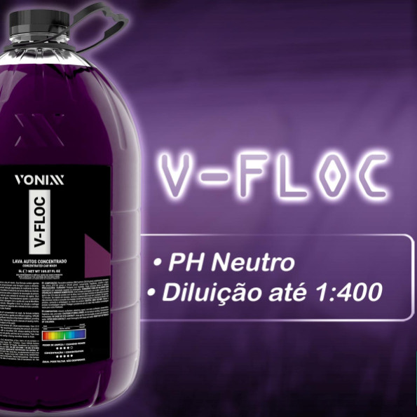 O Shampoo V-Floc Lava Auto Super Concentrado da Vonixx é o produto ideal para quem busca uma limpeza profunda e eficaz para o seu veículo. Com 5 litros de volume, este shampoo super concentrado proporciona uma excelente relação custo-benefício, pois rende muito mais do que os shampoos comuns. Sua fórmula especial permite uma limpeza suave, mas ao mesmo tempo poderosa, capaz de remover até as sujeiras mais difíceis. Além disso, o V-Floc é fácil de usar e não danifica a pintura do seu carro. Com o Shampoo V-Floc Lava Auto Super Concentrado da Vonixx, a limpeza do seu veículo será sempre uma tarefa simples e eficiente.Especificações Técnicas:- Fabricante: Vonixx;- Formula com PH Neutro;- Diluição: até 1:400 no balde ou 1:20 na Snow Foam;- Possui Agentes Condicionadores e Tensoativos Especiais;- Produto de Grande Rendimento para Limpeza e Condicionamento;- Alto Grau de Lubrificação, Lavagem Suave e Poder Desengraxante;- Promove Brilho e um Aspecto Renovado da Pintura;- Conteúdo: 5 Litros.Modo de Uso:Realizar a pré-lavagem do veículo para retirada do excesso de sujeira;Diluir aproximadamente 10ml de V-Floc em 4 litros de água. Recomendamos ajustar quantidade de produto conforme o nível de sujeira;Iniciar a lavagem com o auxílio de luva de microfibra, sempre começando pela parte superior do veículo;Mergulhar a luva na solução e esfregar suavemente, até completar todo o veículo;Enxague em seguida até a retirada de todo o produto;Recomendamos o uso da toalha de secagem para finalizar.Composição:- Tensoativo aniônico (288,5 g/mol e 320,00 g/mol), alcalinizante, tensoativo não iônico (617,00 g/mol e 379,00 g/mol), conservante, fragrância, corante e água.