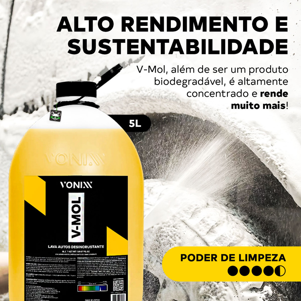 Shampoo Automotivo Lava Limpeza Pesada Barro Vmol 5L Vonixx O MELHOR MOL DESINCRUSTRANTE DO MERCADO Elimine barro, óleo e sujeiras extremas sem esforço, mantendo a pintura protegida e o brilho do veículo. O V-Mol é um lava autos desincrustante e desengraxante de alta performance, desenvolvido para remover sujeiras pesadas sem danificar a superfície. Com fórmula biodegradável. • Remove barro, óleo e sujeiras difíceis • Seguro para pintura e superfícies sensíveis • Melhor custo-benefício do mercado • Ultra concentrado: Diversas diluições APLICAÇÃO - Exterior do veículo - Caixa de Roda ALTO PODER DE LIMPEZA Remove desde sujeiras mais leves até as mais pesadas, como barro, óleo e outras manchas difíceis. ALTA DESEMPENHO E SUSTENTABILIDADE Fórmula tecnológica e biodegradável, promove uma limpeza eficaz sem agredir a pintura do veículo. RENDIMENTO INCRÍVEL Ultra concentrado para diversas diluições com alto poder de rendimento. DILUIÇÃO IDEAL PARA CADA NECESSIDADE - Sujeira leve/manutenção: 1:100 - Sujeira média: 1:50 - Sujeira pesada 1:10 COMO USAR: 1. Dilua o produto na proporção desejada; 2. Inicie a lavagem com o auxílio de uma luva de microfibra, começando pelas partes superiores do veículo; 3. Esfregue o produto suavemente em toda a superfície do veículo; 4. Aguarde alguns minutos para que o produto possa agir; 4. Enxague em seguida com uma lavadora de alta pressão até retirar todo o produto; 5. seque toda a superfície a fim de evitar manchas. ESPECIFICAÇÕES TÉCNICAS: - Volume: 5L - Desincrustante - Alto poder de limpeza - Ultra concentrado - Diluição: Sujeira leve/manutenção: 1:100 Sujeira Média: 1:50 Sujeira pesada 1:10 - Estado Físico: Líquido Viscoso - Cor: Amarelo Alaranjado - Odor: Cereja intenso - pH: 11,0 - 11,5 - Solúvel em Água CONTEÚDO DA EMBALAGEM: - 01. Lava Auto Desincrustante V-Mol 5L Vonixx