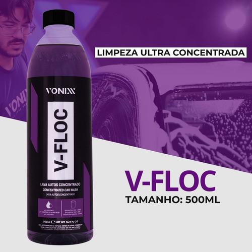 V-Floc é um lava autos de alta performance e de pH neutro. Sua fórmula contém agentes condicionadores e tensoativos especiais que proporcionam uma lavagem suave e eficiente. V-Floc tem alto grau de lubrificação, promovendo redução significativa do coeficiente de atrito, proporcionando um melhor deslize da luva microfibra e reduzindo de forma efetiva as chances de micro riscos na pintura. V-Floc também promove brilho e aspecto de renovação da pintura. Tamanho: 500ML Diluição: 1:20 - Uso na Snow Foam 1:400 - Lavagem comum com balde Informações adicionais: tem alto grau de lubrificação e proporciona lavagem suave Tem poder de limpeza de um shampoo com poder desengraxante -PH neutro -Alto rendimento -Limpeza e condiciona Modo de usar: 1. Realizar a pré-lavagem do veículo para retirada do excesso de sujeira; 2. Diluir aproximadamente 10ml de V-FLOC em 4 litros de água; Recomendamos ajustar quantidade de produto de acordo com o nível de sujeira; 3. Iniciar a lavagem com o auxílio de luva de microfibra, sempre começando pela parte superior do veículo; 4. Mergulhar a luva na solução e esfregar suavemente, até completar todo o veículo; 5. Enxague em seguida até a retirada de todo o produto; 6. Recomendamos o uso da toalha de secagem para finalizar