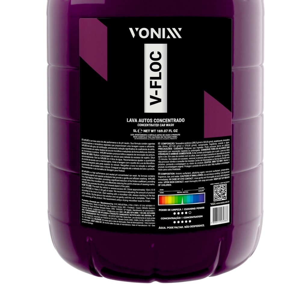 Shampoo Automotivo Alta Performance Concentrado V-Floc 2008049 Vonixx 5 Litros Características V-Floc é um lava autos de alta performance e de pH neutro. Sua fórmula contém agentes condicionadores e tensoativos especiais que proporcionam uma lavagem suave e eficiente. V-Floc tem alto grau de lubrificação, promovendo redução significativa do coeficiente de atrito, proporcionando um melhor deslize da luva microfibra e reduzindo de forma efetiva as chances de microrriscos na pintura. V-Floc também promove brilho e aspecto de renovação da pintura. Informações Técnicas - Diluição: 1:20 - Uso na Snow Foam; 1:400 - Lavagem comum com balde; - Tem alto grau de lubrificação e proporciona lavagem suave; - Tem poder de limpeza de um shampoo com poder desengraxante; - PH neutro; - Alto redimento; - Limpeza e condiciona; - Redimento: até 2000 litros de solução. Mode de usar 1. Realizar a pré-lavagem do veículo para retirada do excesso de sujeira. 2. Diluir aproximadamente 10ml de V-FLOC em 4 litros de água; Recomendamos ajustar quantidade de produto de acordo com o nível de sujeira. 3. Iniciar a lavagem com o auxílio de luva de microfibra, sempre começando pela parte superior do veículo. 4. Mergular a luva na solução e esfregar suavemente, aé completar todo o veículo. 5. Enxague em seguida até a retirada de todo o produto; 6. Recomendamos o uso da toalha de secagem para finalizar. Qualidade: Trabalhamos com produtos de fabricantes reconhecidos em todo mercado brasileiro e internacional. Vendemos produtos de excelente desempenho para uso profissional. Conte com nosso suporte para tirar dúvidas referentes à utilização dos produtos. Observação: - Todas as informações divulgadas são de responsabilidade do Fabricante/Fornecedor; - Imagens meramente ilustrativas, consulte nosso atendimento para mais detalhes.