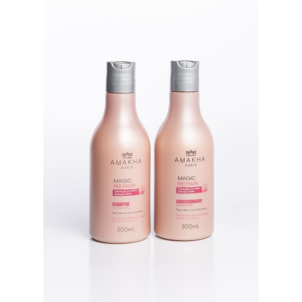 Shampoo hidratante Magic Repair 300ml Amakha Paris - Limpeza suave e redução de frizz - para todos os tipos de cabelos. Ativos: Água de coco, Queratina, Colágeno, Pantenol e Aminoácidos. Benefícios: Limpeza suave com ação reparadora hidratante e nutritiva, que proporciona aspecto saudável e brilho aos fios. Livre de sal e parabenos.