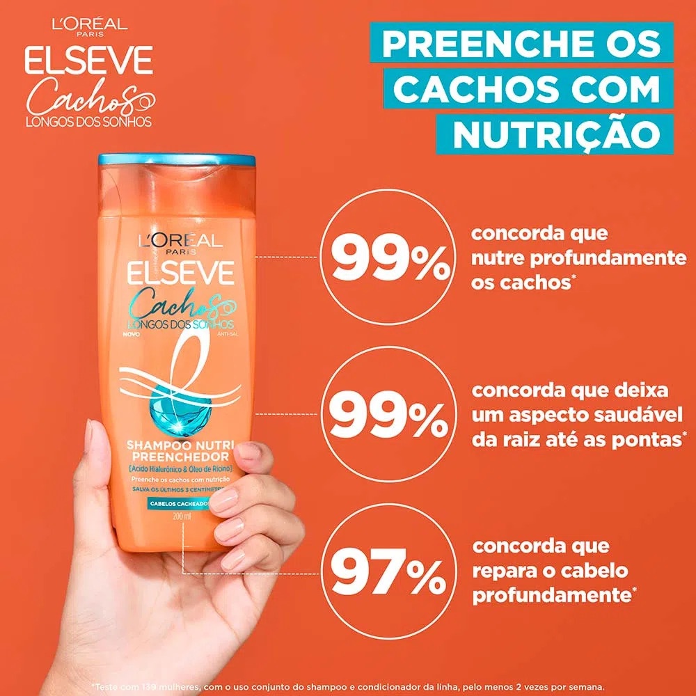 Shampoo Nutri Preenchedor Cachos Longo dos Sonhos Elseve Loréal Paris 200ml O Shampoo Nutri Preenchedor de Elseve, além de limpar as impurezas, preenche o cabelo com nutrição profunda até as pontas, para cachos mais longos, fortes e definidos desde o primeiro uso. Com nosso poderoso coquetel, nossa fórmula trata e sela os cachos até as pontas para salvar até os últimos 3 cm dos seus cachos. Com Ácido Hialurônico que preenche a fibra capilar com hidratação profunda e Óleo de Rícino que nutre profundamente e sela os fios até as pontas fortalecendo e definindo os cachos. Modo de Usar: Aplique nos cabelos molhados, massageie e enxágue. Repita se necessário. Precaução: Manter fora do alcance das crianças. caso o produto caia nos olhos, lave-os imediatamente com água.