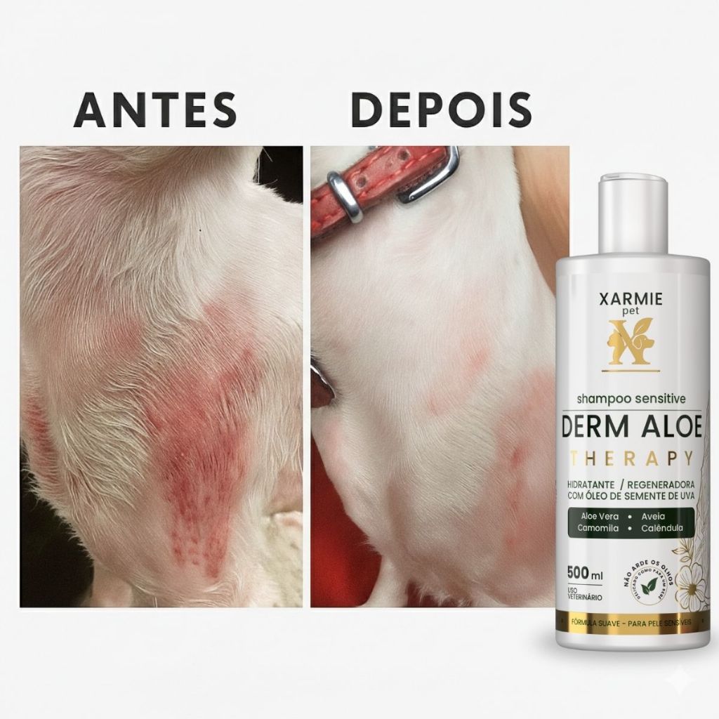 🐾 Shampoo PET Tratamento Dermatite Canina Derm Aloe Therapy XARMIE 500ml A solução completa para cães que sofrem com dermatite, coceiras intensas, vermelhidão e irritações constantes na pele. A fórmula terapêutica com ativos naturais acalma imediatamente, hidrata profundamente e recupera a barreira cutânea, evitando o ciclo de coçar > ferir > inflamar. Ideal para uso contínuo, seguro e suave até para peles altamente sensíveis. ___________________________________________________________________________________________ 🔥 Principais Problemas Que Ele Resolve ✔️ Dermatite Canina (atópica, alérgica, de contato ou por fungos) ✔️ Coceira frequente que causa feridas e desconforto ✔️ Pele vermelha, irritada e sensível ao toque ✔️ Ressecamento, descamação e áreas ásperas ✔️ Pelos fracos, quebradiços e sem brilho _____________________________________________________________________________________- 🌿 Como a Fórmula Atua na Pele Aloe Vera – Repara e regenera o tecido cutâneo, devolvendo hidratação. Camomila – Acalma a irritação e reduz a coceira de forma natural. Calêndula – Ação cicatrizante para peles sensibilizadas. Aveia Coloidal – Cria proteção suave que retém hidratação e reduz ardor e sensibilidade. Óleo de Semente de Uva – Nutre os fios, devolve brilho e fortalece a pelagem. _____________________________________________________________________________________ 💧 Sinergia Inteligente que Trata a Dermatite de Verdade Enquanto a Aloe Vera regenera, a Calêndula recupera a pele, a Camomila reduz inflamações, a Aveia protege e o Óleo de Semente de Uva mantém a nutrição, evitando que a pele volte a sensibilizar. É tratamento, não apenas limpeza. A cada banho, mais conforto, equilíbrio e alívio. ________________________________________________________________________________________ ❤️ Seu Pet Não Precisa Mais Sofrer Se o seu cão está coçando sem parar, inquieto, irritado ou com a pele machucada… Você pode dar alívio real começando HOJE. Um banho que cura, acalma e traz bem-estar. 👉 Adicione ao carrinho agora Seu pet merece um banho sem dor. 🐕💚