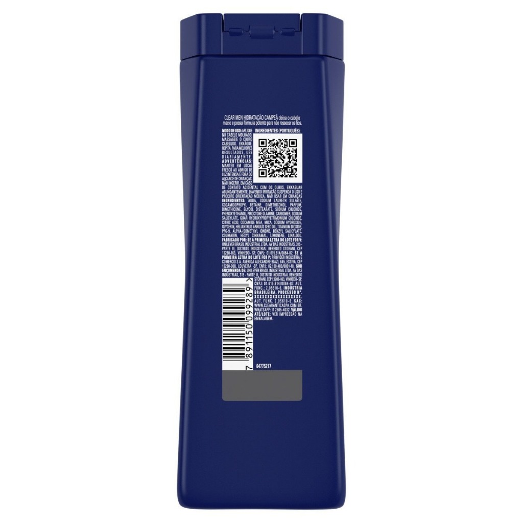 Descrição do Produto Shampoo Clear Men Hidratação Campeã Vini Jr. 200 ml Principais Características: • Fórmula desenvolvida especialmente para o público masculino, ajudando a combater a caspa desde a primeira lavagem. • Tecnologia de hidratação que atua diretamente no couro cabeludo, mantendo-o saudável e equilibrado. • Limpeza eficiente que remove impurezas e oleosidade excessiva sem ressecar os fios. Benefícios: • Reduz o aparecimento de caspa com uso contínuo. • Proporciona sensação de frescor e limpeza prolongada. • Mantém o cabelo hidratado, ajudando a evitar o ressecamento. • Contribui para fios mais fortes e couro cabeludo mais saudável. Diferenciais do Produto: • Edição especial Vini Jr., trazendo identidade visual exclusiva. • Shampoo desenvolvido com expertise da marca Clear, referência no combate à caspa. • Equilíbrio entre limpeza profunda e hidratação, ideal para o dia a dia. Especificações Técnicas: Peso: 200 ml Instruções de Uso: Aplicar o shampoo nos cabelos molhados, massagear suavemente o couro cabeludo até formar espuma e enxaguar completamente. Repetir o processo se necessário. Avisos e Precauções: Evitar contato com os olhos. Caso ocorra, enxaguar imediatamente com água. Manter fora do alcance de crianças. Conservar em local fresco e ao abrigo da luz. O que está incluso? • 1 unidade de Shampoo Clear Men Hidratação Campeã Vini Jr. 200 ml ---- DÚVIDAS FREQUENTES ---- Os produtos são originais? Sim. Todos os nossos produtos são originais. Emitem nota fiscal? Sim. Emitimos nota fiscal para todos os pedidos.