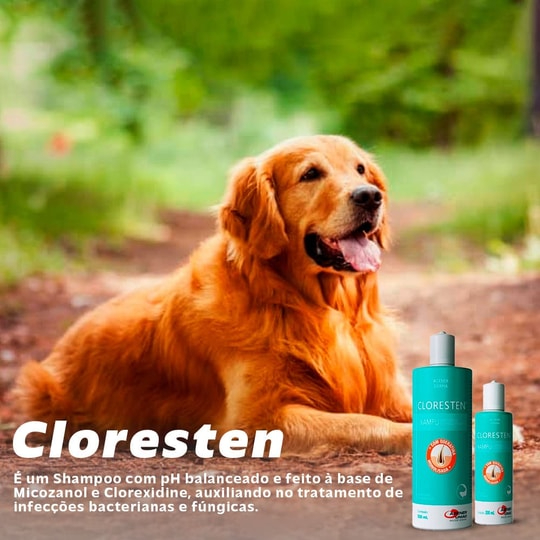 VCT 2027 O Shopping Rações Matriz atua há 13 anos no mercado pet, sempre oferecendo inovação, atendimento humanizado e reconhecimento pela excelência, produtos 100% originais, confira nosso instagram. O Shampoo Cloresten 200ml é um produto antibacteriano e antifúngico à base de clorexidine e miconazol, indicado para cães, gatos e até cavalos no tratamento e controle de piodermites, dermatofitoses, micoses cutâneas e malasseziose. Além de combater infecções causadas por fungos e bactérias, também promove maciez e perfume à pelagem. Fácil de aplicar, com excelente custo-benefício e eficiência comprovada. Uso recomendado de 1 a 2 vezes por semana, ou conforme orientação veterinária.