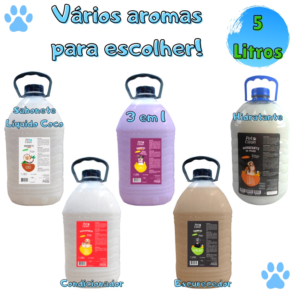 IMPORTANTE: O SHAMPOO DE 5 LITROS DA PET CLEAN AGE, TAMBÉM, COMO CONDIONADOR! LAVA E CONDICIONA OS PELOS! EXCELENTE QUALIDADE! ;) PERGUNTAS FREQUENTES POSSO USAR O SHAMPOO E CONDICIONADOR DA PET CLEAN EM FILHOTES? Sim! Desde que o filhote tenha mais de 2 meses de vida. Banhos em geral não são recomendados em filhotes com menos de 2 meses, pois, por serem novos, podem ser sensíveis à alguns produtos. O SHAMPOO É APLICADO DA MESMA FORMA PARA CÃES E GATOS? Sim! A aplicação é a mesma para ambos animais. O QUE FAZER SE O SHAMPOO TOCAR OS OLHOS? Se o shampoo vier a tocar os olhos, recomendamos que enxague com água em abundância. Salientamos que o shampoo tem PH neutro, o que não será danoso aos olhos do animal. No entanto, recomendamos sempre evitar o contato do produto com os olhos. POSSO USAR CONDICIONADOR MESMO DEPOIS DE USAR O SHAMPOO ? Sim! Apesar de não ser necessário, pois junto com o shampoo já há condicionador, você pode usar outro condicionador mais específico se desejar! Cachorros e gatos limpos e cheirosos são grandes desejos de todos os amantes de animais, não é mesmo? Às vezes ficamos perdidos, entre tantas opções, sobre qual shampoo escolher para darmos um bom banho no nosso peludinho... O Shampoo e Condicionador para Cães e Gatos da Pet Clean 5L traz: Limpeza, Condicionador e Hidratação. Benefícios do Shampoo e Condicionador 5L da Pet Clean: Limpa, condiciona e hidrata os pelos. Dispensa o uso de condicionador. Hidratante, revitalizante e nutrição intensa. pH Neutro: não agride o animal. Pelos macios e cheirosos. Ideal para uso em Pet Shop Desenvolvido paraa goomers Rende bastante Informações Técnicas: Produto: Shampoo e Condicionador para Cães e Gatos Pet Clean - A escolher - 5L Marca: Pet Clean Tipo: Higiene Animal: Cachorros e Gatos Porte: Pequeno, Médio e Grande. Acima de 2 meses. Raça Específica: Não Sexo Específico: Não Itens Inclusos: 1x Shampoo e Condicionador para Cães e Gatos Pet Clean - A escolher - 5L Apresentação: Frasco em Plástico Composição: Lauril éter sulfato de sódio, Betaína, Óleo de Amêndoas, Extratos Naturais, Silicone, Agente Condicionante, Metilparabeno, Fragrância, Veículo Q.S.P. MODO DE USAR Aplique o produto no cachorro ou gato ainda molhado e massageie por toda a pelagem do pet até que se forme espuma. Deixe o shampoo agir por alguns minutos e enxágue bem. PRECAUÇÕES Evite contato com os olhos e mucosas do animal. Manter longe de alimentos e produtos domésticos. Manter em locais secos, fora do alcance de crianças e animais domésticos. Não utilizar em filhotes com menos de 2 meses de vida.