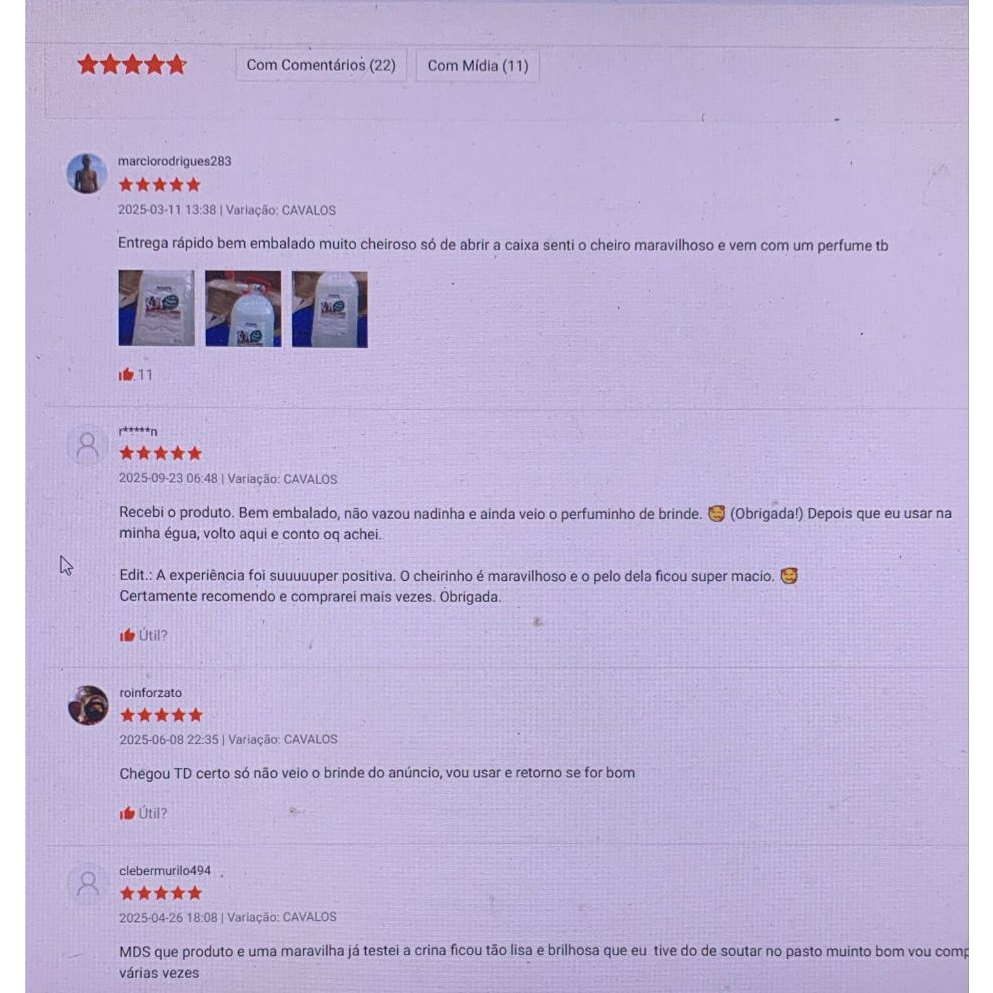| Shampoo Condicionador Citronela Para Cavalos Forte Cavalos de Raça ... este produto | R$ 49,80 | 17% | 4.8/5 | 38 |