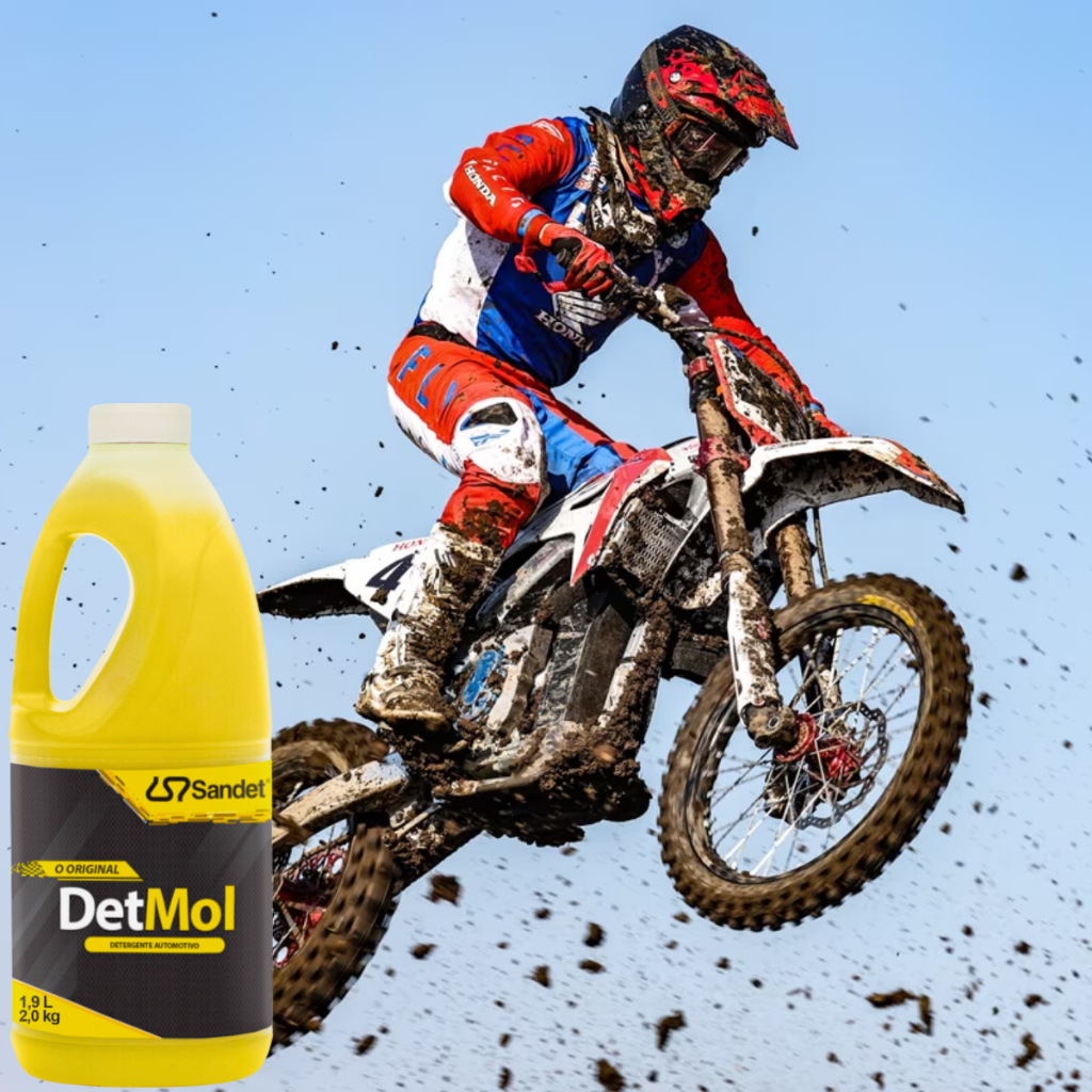 DET MOL DETERGENTE USO GERAL SANDET 1,9L DESCRIÇÃO: O original e inigualável produto Det Mol surpreende pela praticidade e eficiência na limpeza pesada de veículos e outras superfícies. Desempenho excelente na limpeza de motos e equipamentos de MotoCross. Não ataca a pintura e não oxida as peças. Experimente e descubra todas as vantagens de um produto testado e aprovado por quem entende! APLICAÇÃO: - É usado na lavagem de carrocerias e chassis de veículos pesados, de passeio e motos. - Indicado também para a remoção de graxa, gordura, limpeza de pisos, paredes, máquinas e superfícies pintadas em geral. MODO DE USO: - Para limpeza leve, diluir o produto em água na concentração de 1%, ou seja, 1 litro do produto para se preparar 100 litros de solução. - Para limpeza pesada, diluir o produto na concentração de 10%, ou seja, 1 litro do produto para se preparar 10 litros de solução. - Recomenda-se a utilização de E.P.I.'s durante a preparação e aplicação da solução (luvas, máscara, óculos, botas emborrachadas e avental vinílico).