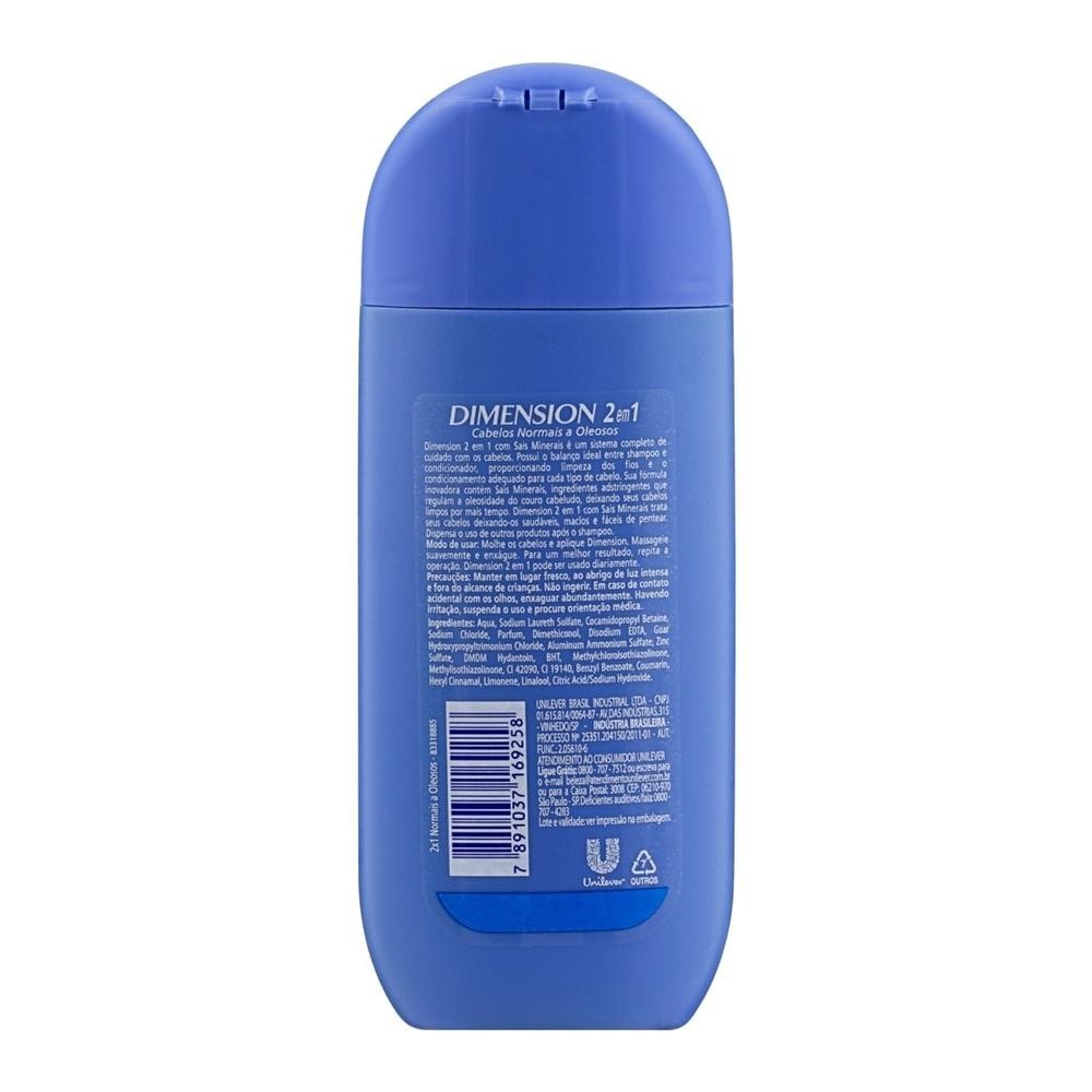 Dimension 2 em 1 Cabelos Oleosos oferece o balanço ideal entre shampoo e condicionador, o que proporciona limpeza e condicionamento para os fios. Possui Hydroviton em sua fórmula, um ingrediente hidratante que devolve a umidade perdida dos cabelos, tornando-o mais sedoso e com brilho. Pode ser usado diariamente. Disponível em embalagem de 200mL.