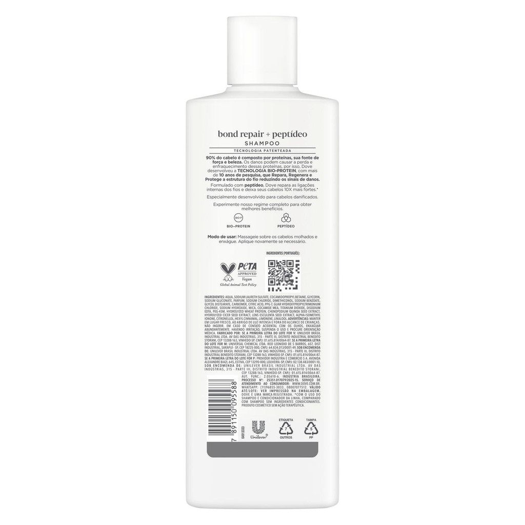 "• Dove Shampoo Bond com Peptídeos em sinergia com o condicionador reconstrói profundamente os fios com tecnologia de reparação capilar para cabelos danificados e quebradiços • O shampoo e condicionador da linha Bond Intense Repair atuam na restauração das ligações capilares internas, deixando os cabelos até 10X mais fortes* • Tecnologia Bio-Protein desenvolvida por mais de 10 anos com aminoácidos e peptídeos para fortalecer, regenerar e proteger a estrutura dos fios • Fórmula com ação instantânea que devolve maciez e brilho desde os primeiros usos • Para melhores resultados, use com o Dove Shampoo Bond Intense Repair + Peptídeo para cabelo danificado e finalize o regime completo com o tratamento intensivo da linha • Indicado para cabelos danificados, frágeis ou quebradiços, com uso diário para máxima performance Dove Shampoo Bond Intense com Peptídeo oferece reparação intensa para cabelos danificados, frágeis ou quebradiços. Sua ação nutritiva devolve maciez, brilho e resistência desde o primeiro uso, deixando os fios visivelmente saudáveis. A fórmula combina Aminoácidos com a tecnologia Bio-Protein, resultado de mais de 10 anos de pesquisa, que repara, regenera e protege 90% da estrutura proteica do fio. Juntos, eles selam cutículas, restauram ligações internas e entregam até 10X mais força*. Indicado para todos os tipos de cabelo que precisam de recuperação frequente, o condicionador pode ser usado diariamente. Para máxima performance, siga o regime completo: Shampoo para cabelos danificados Dove Bond Intense Repair, Condicionador Bond Intense Repair + Peptídeo e tratamento semanal. *Com o uso do shampoo e condicionador da linha, comparado com shampoo sem ingredientes condicionantes."