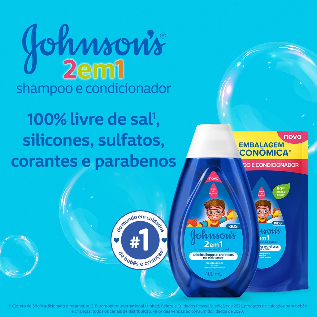 Oque é e para que serve? O cabelo das crianças é mais fino e delicado que o cabelo dos adultos. Por isso, criamos a linha JOHNSON’S® desenvolvida para crianças, formulada com ingredientes naturais específicos para os pequenos: cabelos macios, brilhantes e saudáveis. O Shampoo e Condicionador 2 em 1 JOHNSON’S® foi especialmente desenvolvido para cuidar do cabelo e do couro cabeludo em desenvolvimento das crianças: limpa suavemente, perfuma e tem mais agentes condicionantes² para tornar a rotina do banho mais prática com apenas um passo. além de contar com a exclusiva fórmula CHEGA DE LÁGRIMAS®, que evita irritação nos olhos. Toda a linha é hipoalergênica, formulada para ser suave, livre de sal, silicone, corantes, parabenos e sulfatos. Com pH fisiológico e dermatologicamente testado. Frasco com 20% de plástico reciclado, cuidando do seu bebê e do futuro do nosso planeta. Benefícios e diferenciais: Rotina do banho mais prática com apenas um passo; Cabelos limpos e cheirosos por mais tempo1; Cabelos macios e hidratados com 3x mais agentes condicionantes2; 95% de ingredientes de origem natural3; 100% livre de sal4, silicone, sulfatos, corantes e parabenos. Como usar: Aplique JOHNSON’S® 2 em 1 nos cabelos molhados, massageando suavemente até obtenção da espuma. Em seguida, enxague bem. Adequado para o uso diário. Indicações de uso: Para crianças de todas as idades. Composição: Aqua/água, Cocamidopropyl Betaine/cocamidopropil betaína, Decyl Glucoside/decil glicosídeo, Glycerin/glicerol, Sodium Methyl Cocoyl Taurate/metil cocoil taurato de sódio, Sodium Cocoyl Isethionate/cocoil isetionato de sódio, PEG-80 Sorbitan Laurate/laurato de sorbitano PEG-80, Citric Acid/ácido cítrico, Glycol Distearate/diestearato de etilenoglicol, Sodium Benzoate/benzoato de sódio, Parfum/perfume, Polyquaternium-10/poliquatérnio-10, PEG-150 Distearate/diestearato de PEG-150, Disodium EDTA/edetato dissódico. Precauções: Mantenha fora do alcance de crianças. Deve ser aplicado por adulto ou sob sua supervisão. Não usar se o couro cabeludo estiver ferido ou irritado. Em caso de irritação, suspender o uso e procurar um médico. Evitar contato com os olhos. Caso o produto entre em contato com os olhos, lavar com água corrente em abundância e procurar um médico. Este produto foi formulado de maneira a minimizar possível surgimento de alergia. 1Vs JOHNSON’S® Shampoo Cheirinho Prolongado. 2Vs JOHNSON’S® Shampoo de glicerina. 3Calculado conforme ISO 16128. 4Cloreto de Sódio adicionado.