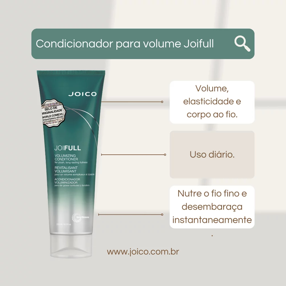 O Kit Joico JoiFull Shampoo + Condicionador é a solução ideal para cabelos finos que necessitam de volume, corpo e leveza. Com uma fórmula inovadora, esses produtos oferecem uma limpeza suave e condicionamento eficaz, proporcionando fios mais encorpados e com movimento natural. A linha JoiFull é desenvolvida para aumentar o volume dos cabelos intensamente, promovendo resultados duradouros quando utilizado o sistema completo. Ideal para quem busca cabelos mais volumosos e com aparência saudável. Produto 100% original, lacrado de fábrica e com selo de autenticidade, garantindo segurança e procedência. Especificações Técnicas: Marca: Joico Linha: JoiFull Contém: Shampoo 300 ml + Condicionador 250 ml Indicação: Cabelos finos que necessitam de volume Benefícios principais: Aumenta o volume dos cabelos intensamente Proporciona corpo e leveza aos fios Limpeza suave sem pesar Condicionamento eficaz para fios mais encorpados Garantia: Produto 100% original, lacrado e com selo de autenticidade Cuidados / Modo de Uso: Shampoo Joico JoiFull: Aplique nos cabelos molhados, massageando suavemente o couro cabeludo. Enxágue bem. Condicionador Joico JoiFull: Aplique do comprimento às pontas, deixando agir por alguns minutos. Enxágue bem. Para melhores resultados: Utilize em conjunto com outros produtos da linha Joico JoiFull.