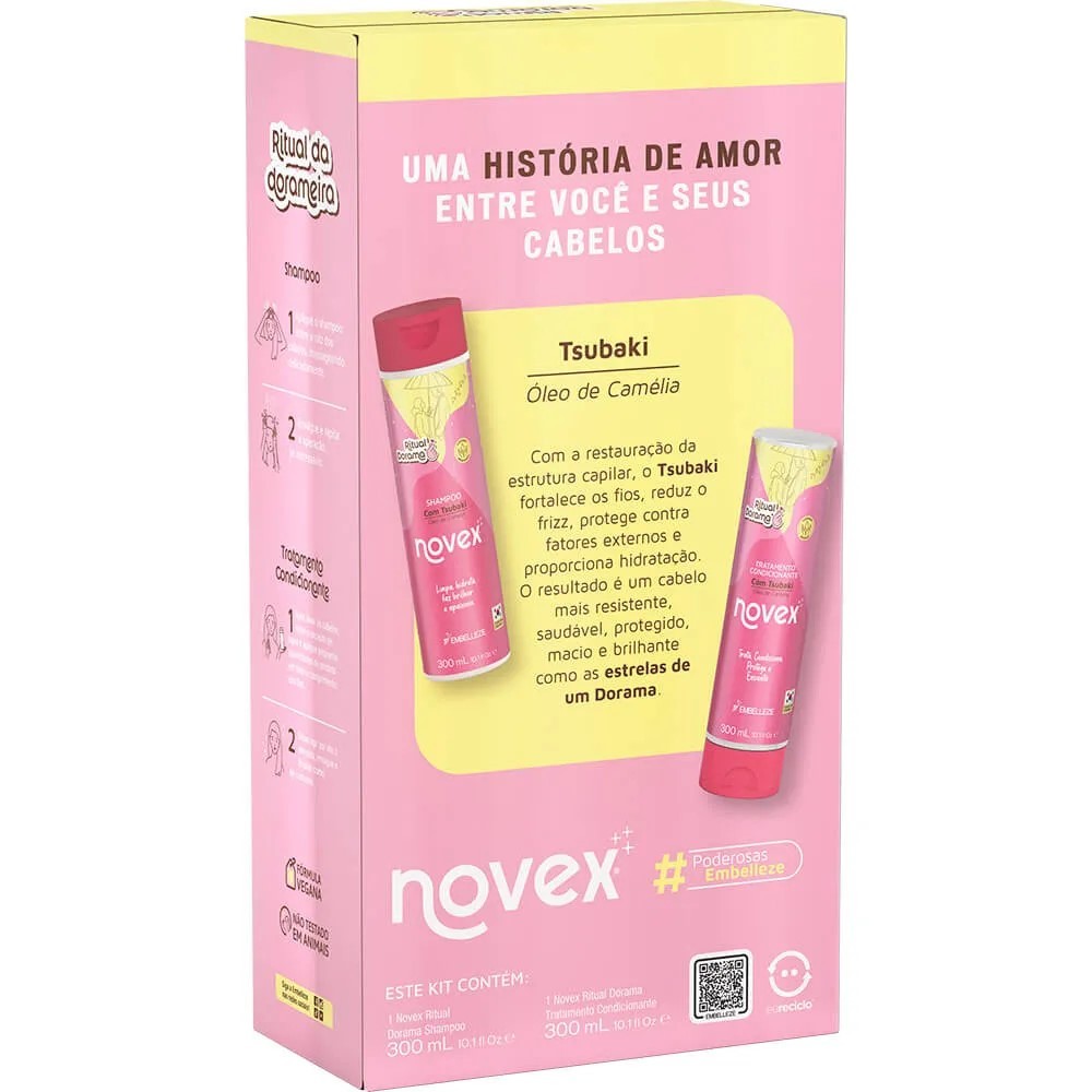 A Embelleze, referência em inovação e cuidados com os cabelos, apresenta o Kit Shampoo e Condicionador Novex Ritual Dorama, um cuidado para o dia a dia que vai transformar seus fios da raiz às pontas. Inspirada nos segredos milenares da cultura japonesa e romântica cultura dos doramas coreanos, esta linha exclusiva foi desenvolvida com o poderoso ativo tsubaki, extraído da preciosa flor de camélia japonesa. Reconhecido por séculos por seus incríveis benefícios, o tsubaki proporciona nutrição profunda, força e brilho, ajudando a realçar a identidade única de cada mulher. Shampoo e Condicionador Novex Ritual Dorama: uma história de amor e cuidado. O Novex Ritual Dorama é muito mais do que um simples cuidado com os cabelos. Ele é a chave para uma experiência sensorial que conecta beleza, autoconfiança e bem-estar. Na Embelleze, acreditamos que a beleza é uma força capaz de transformar vidas. Não vendemos apenas produtos para os cabelos, mas a confiança necessária para enfrentar qualquer desafio. Seja para um dia no trabalho ou um passeio ao ar livre, essa linha de shampoo e condicionador foi pensada para mulheres que enxergam no cuidado com os cabelos uma declaração de (auto)amor. Indicação: O Kit Shampoo e Condicionador Novex Ritual Dorama é ideal para atender às necessidades de qualquer tipo de cabelo, seja ele liso, cacheado, ondulado ou crespo, principalmente para quem AMA doramas e gostaria de entrar mais em contato com esse universo. Ação: Com uma fórmula cuidadosamente desenvolvida, livre de parabenos, silicones e sal, proporciona um cuidado mais natural e delicado. Tanto o shampoo quanto o condicionador trabalham em sinergia para garantir fios hidratados, macios e com um brilho fascinante. Transforme a sua rotina de cuidados em um verdadeiro ritual de beleza, independentemente do tipo ou textura dos seus cabelos. Ativos: A combinação poderosa dos ingredientes tsubaki e óleo de camélia faz desse kit de shampoo e condicionador um aliado indispensável para quem busca cabelos mais saudáveis e radiantes. Ao unir tradição e tecnologia, o Kit Novex Ritual Dorama entrega um tratamento eficiente e, ao mesmo tempo gentil, ideal para quem procura resultados transformadores sem abrir mão de um toque suave e saudável para os fios. Benefícios: O Kit Shampoo e Condicionador Novex Ritual Dorama oferece inúmeros benefícios para os seus cabelos, garantindo um cuidado diário profundo e eficaz. Com o uso do shampoo, seus fios não só ficam limpos, mas também ganham hidratação, nutrição e um brilho radiante. Já o condicionador sela as cutículas capilares, protege e envolve os cabelos como nos romances mais encantadores. Com sua fórmula vegana, não testada em animais, ele restaura a estrutura capilar e promove um cuidado intenso e completo. Resultado: O resultado com o uso contínuo da linha Novex Ritual Dorama, seus cabelos ganham uma aparência saudável e natural, com brilho radiante e toque sedoso. Descubra o poder transformador dos produtos Embelleze das linhas Novex e sinta-se confiante todos os dias. Modo de Uso: Aplique uma quantidade adequada de shampoo nas mãos e espalhe uniformemente sobre o couro cabeludo e os fios úmidos. Massageie suavemente com a ponta dos dedos, fazendo movimentos circulares para ativar a circulação e limpar profundamente o couro cabeludo. Enxágue abundantemente com água até remover todo o produto. Se necessário, repita o processo para uma limpeza mais profunda. Modo de uso do Condicionador Novex Ritual Dorama: Um toque de paixão: Após o uso do shampoo, aplique o condicionador nos cabelos ainda úmidos, distribuindo do comprimento às pontas. Evite a aplicação diretamente no couro cabeludo. Deixe o condicionador agir por alguns minutos para garantir uma melhor hidratação e desembaraço. Enxágue bem até remover completamente o produto, certificando-se de que não há resíduos nos fios. Composição NOVEX RITUAL DORAMA SHAMPOO: AQUA (ÁGUA), SODIUM LAURETH SULFATE (LAURILETERSULFATO DE SÓDIO), COCAMIDOPROPYL BETAINE (COCOAMIDOPROPILBETAÍNA), GLYCOL DISTEARATE (DIESTEARATO DE ETILENOGLICOL), COCAMIDE DEA (DIETANOLAMINA COCAMIDA), PARFUM (PERFUME), GUAR HYDROXYPROPYLTRIMONIUM CHLORIDE (CLORETO DE GOMA GUAR HIDROXIPROPILTRIMÔNIO), POTASSIUM CHLORIDE (CLORETO DE POTÁSSIO), BENZYL ALCOHOL (ÁLCOOL BENZÍLICO), PHENOXYETHANOL (FENOXIETANOL), POLYQUATERNIUM-7 (POLIQUATÉRNIO-7), HYDROXYETHYL UREA (HIDROXIETIL UREIA), DISODIUM EDTA (EDETATO DISSÓDICO), CHLORPHENESIN (CLORFENESINA), DMDM HYDANTOIN (DIMETILIDANTOÍNA), BHT (BUTIL-HIDROXITOLUENO), GLYCERIN (GLICEROL), LACTIC ACID (ÁCIDO LÁCTICO), POTASSIUM SORBATE (SORBATO DE POTÁSSIO), SODIUM BENZOATE (BENZOATO DE SÓDIO), TOCOPHERYL ACETATE (ACETATO DE TOCOFERILA), CAMELLIA JAPONICA SEED OIL (ÓLEO DA SEMENTE DE CAMELLIA JAPONICA). NOVEX RITUAL DORAMA TRATAMENTO CONDICIONANTE: AQUA (ÁGUA), CETEARYL ALCOHOL (ÁLCOOL CETOESTEARÍLICO), GLYCERIN (GLICEROL), ZEA MAYS STARCH (AMIDO), GLYCINE SOJA OIL (ÓLEO DE SOJA), CETRIMONIUM CHLORIDE (CLORETO DE CETRIMÔNIO), PA
