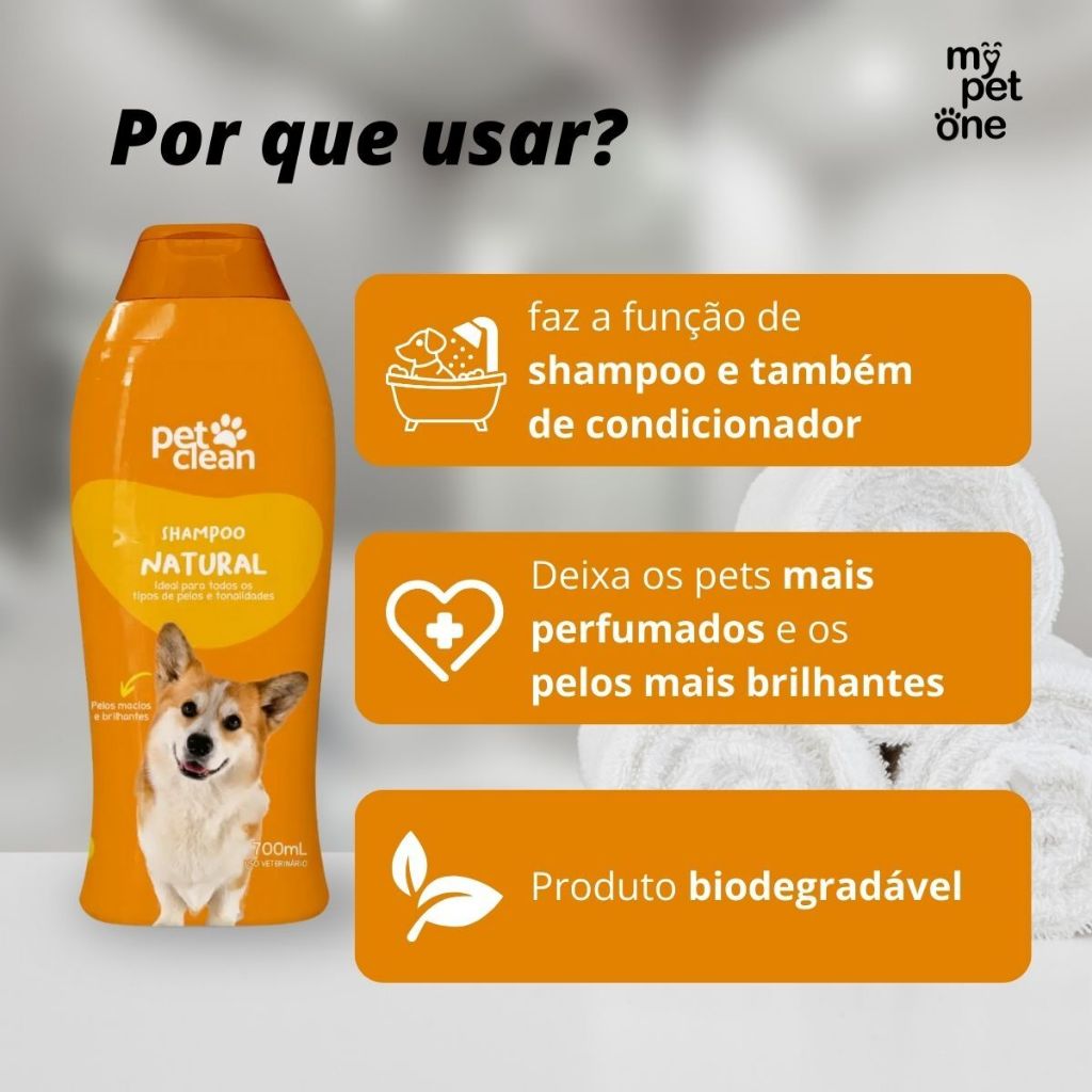Shampoo e Condicionador Pet Clean Natural 2 em 1 - 700ml - Indicado para cães e gatos de todas as idades e raças; - Deixa os pets mais perfumados e os pelos mais brilhantes; - Possui pH neutro. Detalhes O Shampoo e Condicionador Pet Clean Natural 2 em 1, é um produto indicado para cães e gatos de todas as raças, idades e comprimentos de pelos. Com sua formulação balanceada deixa os pelos mais macios, brilhantes e perfumados sem agressão aos olhos e pele do animal. Produto biodegradável de pH neutro. Dicas Especiais O banho remove a camada de gordura que protege a pele dos pets, tornando-a vulnerável à ação de fungos, bactérias e substâncias que podem causar alergias. Após tirar o excesso de água com uma toalha limpa, seque o animal com o secador de cabelo, utilizando apenas a temperatura fria, e mantendo a distância de pelo menos um palmo. Mais de um banho a cada 10 dias é exagero. No máximo um banho por mês em cães de pelagem longa e um banho a cada 3 semanas em gatos Indicação: Cachorros, Gatos Porte/Raça: Raças Mini, Raças Pequenas, Raças Médias, Raças Grandes Idade: Adultos Composição: A cada 100,00 mL: Lauril éter sulfato de sódio ..............................20,00 mL Betaína ............................................................4,00 mL Extrato de maracujá ........................................1,00 mL Agente condicionante .....................................1,00 mL Metilparabeno ..................................................0,10 mL Fragrância ........................................................0,20 mL Veículo Q.s.P ....................................................100,00 mL Apresentação: 700 mL