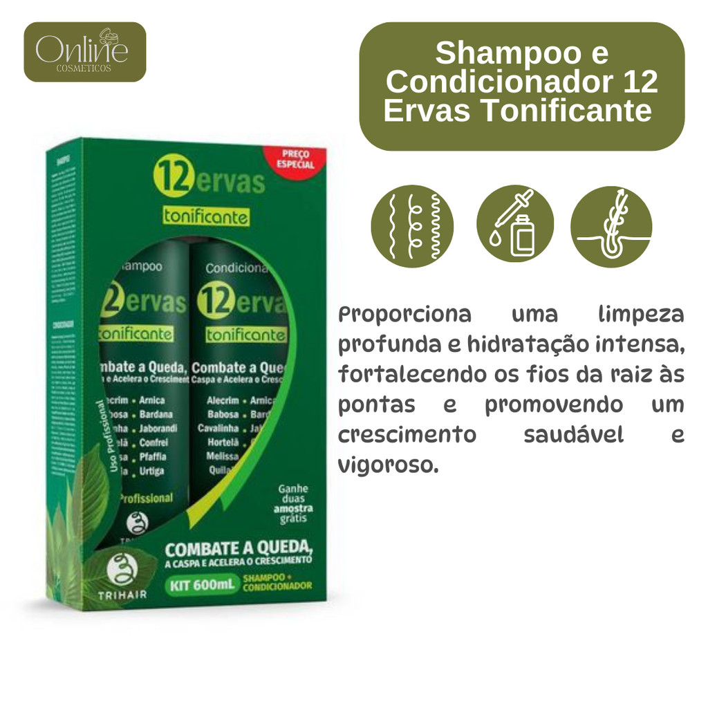 Linha 12 Ervas Tonificante da Trihair – Shampoo e Condicionador A combinação do Shampoo e Condicionador 12 Ervas Tonificante é ideal para combater a queda, caspa e estimular o crescimento saudável dos fios. Com mais de 20 anos no mercado, esses produtos são enriquecidos com extratos vegetais que proporcionam força, brilho e nutrição, promovendo uma limpeza profunda e hidratação, sem ressecar os cabelos. Shampoo 12 Ervas Tonificante: Limpa profundamente os fios e remove o excesso de oleosidade, promovendo o crescimento saudável. Sua fórmula combate a queda, acelera o crescimento e reduz a caspa, deixando os cabelos mais fortes e nutridos. Condicionador 12 Ervas Tonificante: Desembaraça e hidrata os fios, fortalecendo-os da raiz às pontas. A fórmula combate o ressecamento, acelera o crescimento e reduz a quebra dos cabelos, proporcionando maciez, brilho e maleabilidade. Modo de Uso: Shampoo: Aplique no couro cabeludo úmido, massageie por 3 minutos e enxágue. Repita o processo se necessário. Condicionador: Após lavar os cabelos com o shampoo, aplique no comprimento dos fios, penteie com os dedos ou pente e enxágue. Principais Ativos: Alecrim: Controla a oleosidade e estimula o crescimento. Babosa: Hidrata e fortalece com colágeno e vitaminas. Cavalinha: Rejuvenesce e fortalece a fibra capilar. Melissa: Hidrata e combate a caspa. Urtiga: Combate queda e caspa. Quilaia: Tonifica e restaura os fios. Jaborandi: Estimula a renovação celular e reduz a queda. Arnica: Rejuvenesce o couro cabeludo e fortalece os fios. Bardana: Controla a oleosidade e fortalece os fios. Confrei: Promove o crescimento e protege o couro cabeludo. Pfaffia: Estimula a circulação e combate queda. Hortelã: Refresca e combate oleosidade e caspa. Frequência de uso: Pode ser usado diariamente para fortalecer, hidratar e revitalizar os fios. Composição: A composição de cada produto deste conjunto pode ser consultada em sua própria descrição.