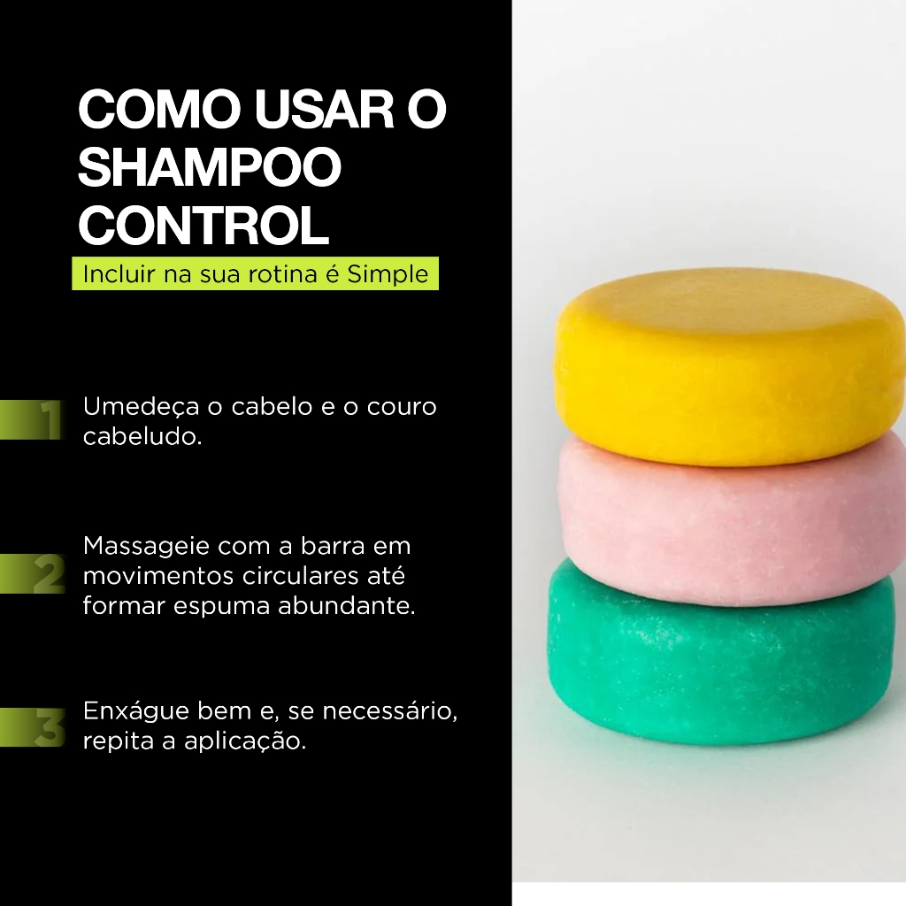 Sobre o Shampoo Sólido - CONTROL: Formulado com Niacinamida, Zinco e extrato oleoso de Alecrim. A Niacinamida, vitamina B3, aumenta o volume dos fios, a elasticidade e o brilho. Ela melhora a aparência e a textura do cabelo, até daqueles que sofreram agressões químicas ou físicas, ajudando a reconstruir a queratina. O zinco auxilia na prevenção do envelhecimento das células, o que diminui a descamação do couro cabeludo, possui propriedades antissépticas que controlam o desenvolvimento de infecções bacterianas e ainda reduz a produção de sebo através da inibição da enzima 5-alfa-redutase. Enquanto isso, o extrato oleoso de Alecrim ajuda a remover os resíduos de oleosidade dos cabelos, sem danificar os fios. Aroma: Chá Verde (Herbal) Modo de Usar: Massagear os cabelos e couro cabeludo úmidos com movimentos circulares até formar espuma abundante. Enxaguar em seguida. Precauções: Uso externo. Manter longe do alcance de crianças. Evitar contato com os olhos. Armazenar em local seco, arejado, ao abrigo da luz e outras fontes de calor. Em caso de irritação, suspenda o uso e, caso os sinais persistam, procure um médico. Composição: Sodium Cocoyl Isethionate, Zea Mays Starch, Cetyl Alcohol, Butyrospermum Parkii Butter, Rosmarinus Officinalis Leaf Extract, Glycerin, Kaolin, Glycine Soja Seed Extract, Sorbitan Caprylate, Niacinamide, Propanediol, Benzoic Acid, Zinc PCA, Caprylic/Capric Triglyceride, Lavandula Angustifolia Extract, Tocopherol, Linalool, Chlorophyllin-Cooper Complex, Helianthus Annuus Seed Oil, Camellia Sinensis Leaf Extract, Prunus Persica Fruit Extract, Amyl Cinnamal, Rosmarinus Officinalis Leaf Extract, Cupressus Sempervirens Leaf/Stem Extract, Jasminum Officinale Flower/Leaf Extract, Fucus Vesiculosus Extract, Vanilla Planifolia Fruit Extract, Plumeria Rubra Flower Extract, Rose Extract, Coriandrum Sativum Fruit/Leaf Extract, Citrus Aurantium Bergamia Fruit Extract. Composição (Português): Cocoil Isetionato de Sódio, Amido, Álcool Cetílico, Manteiga de Butyrospermum Parkii, Extrato da Folha de Rosmarinus Officinalis, Glicerol, Caulim, Extrato da Semente de Glycine Soja, Caprilato de Sorbitana, Nicotinamida, Propanodiol, Ácido Benzoico, Pidolato de Zinco, Triglicerídeo Caprílico/Cáprico, Extrato de Lavandula Angustifolia, Tocoferol, Linalol, Complexo Clorofilina-Cobre, Óleo de Girassol, Extrato da Folha de Camellia Sinensis, Extrato do Fruto de Prunus Persica, Amil Cinamal, Extrato da Folha de Rosmarinus Officinalis, Extrato da Folha/Haste de Cupressus Sempervirens, Extrato da Flor/Folha de Jasminum Officinale, Extrato de Fucus Vesiculosus, Extrato do Fruto de Vanilla Planifolia, Extrato da Flor de Plumeria Rubra, Extrato de Rosa, Extrato de Fruto/Folha de Coriandrum Sativum, Extrato do Fruto de Citrus Aurantium Bergamia. Conteúdo: 70 g / 2.47 oz