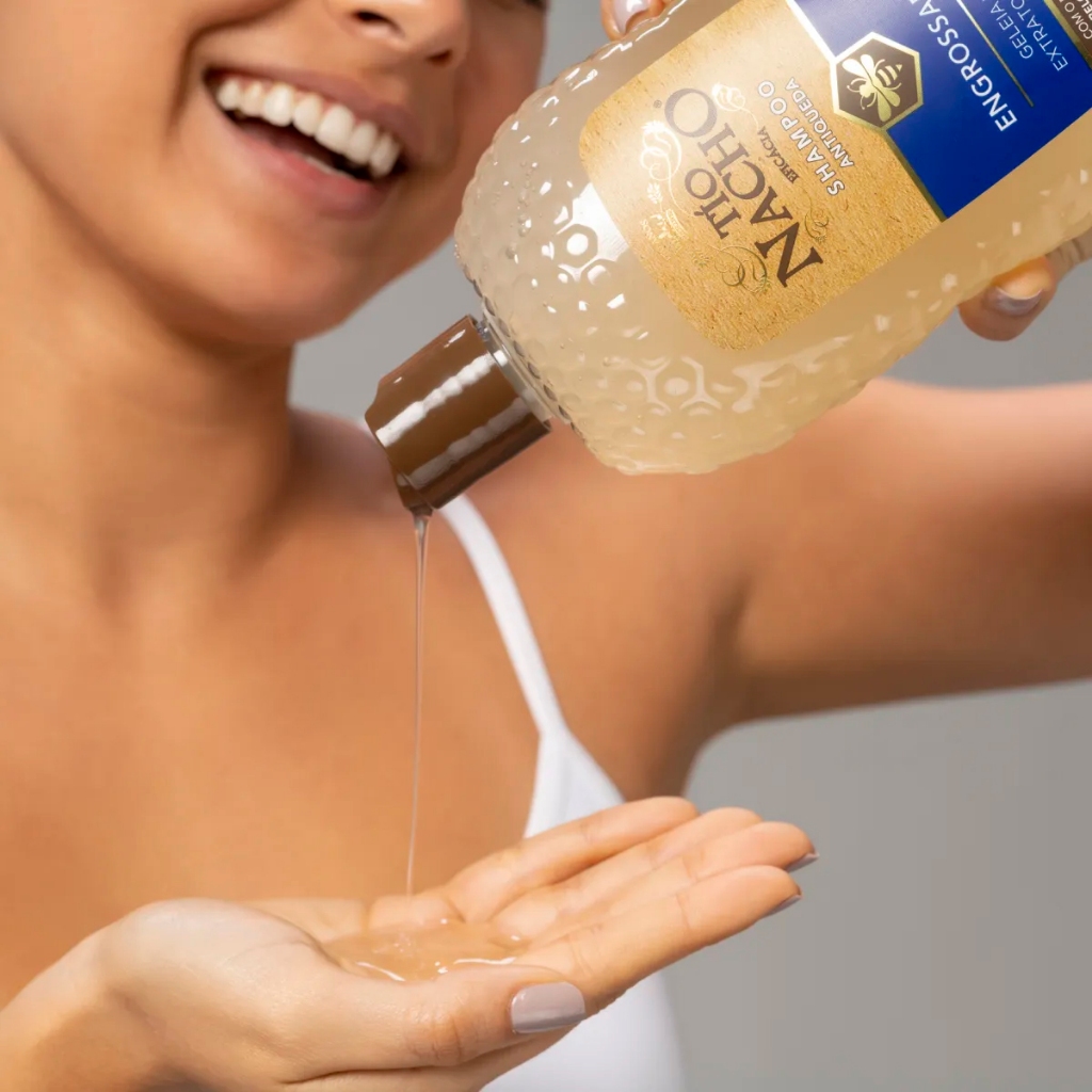 SHAMPOO ENGROSSADOR ANTIQUEDA TIO NACHO 950ML Tio Nacho Engrossador Antiqueda é um shampoo que foi especialmente desenvolvido para quem possui os cabelos finos, quebradiços ou sem volume. Com uma fórmula exclusiva que combina a Geleia Real com um composto de ingredientes de origem natural, aumenta a espessura dos cabelos e tem ação antiqueda, para um cabelo mais forte, com menos quebras, mais volumoso e saudável. Indicado para cabelos finos, quebradiços ou sem volume, o Shampoo Tio Nacho Antiqueda Engrossador possui eficácia comprovada no aumento da espessura dos fios, além de também fortalecer e revitalizar o couro cabeludo. Com ingredientes especiais de origem natural, devolve o brilho e a força dos cabelos opacos e quebradiços. BENEFÍCIOS - Especialmente desenvolvido para cabelos finos, quebradiços ou sem volume - Ação antiqueda, que fortalece e aumenta a espessura dos fios, deixando-os com mais vitalidade e elasticidade - Evita a quebra - Devolve o brilho dos cabelos opacos e sem vida, deixando-os mais macios - Revitaliza o couro cabeludo - Fórmula com Geleia Real e ingredientes de origem natural - Ajuda a manter a aparência de um cabelo jovem INGREDIENTES PRINCIPAIS Geleia Real: substância produzida por abelhas que contém proteínas (como a roialactina, potente na nutrição natural dos fios do cabelo), além de açúcar, lipídeos, vitaminas, aminoácidos, ácido fólico e minerais. Extrato de Urtiga: planta medicinal que possui ação antioxidante e antiqueda. Purifica os cabelos, fortalece os fios e os deixam mais saudáveis, brilhantes e com volume natural. Aloe Vera: planta medicinal que auxilia no crescimento saudável dos cabelos, favorecendo seu fortalecimento e regeneração. Extrato de Ginseng: tem ação revitalizante e ajuda a manter o couro cabeludo saudável. Alfafa: planta que ajuda a melhorar a aparência dos fios opacos, abertos e quebradiços, além de auxiliar contra a quebra. Extrato de Quina: planta com ação revitalizante e adstringente. Dá mais vitalidade, força e grossura para os cabelos, prevenindo a sua queda e tornando-os mais brilhantes e saudáveis. Alecrim: planta que auxilia no combate à oleosidade dos fios, além de fortalecer o couro cabeludo e ajudar a aumentar o diâmetro e volume dos fios dos cabelos. Lúpulo: planta que auxilia na hidratação dos fios, deixando-os mais volumosos e protegendo-os contra as agressões externas. Meliloto: planta que ajuda a combater a fragilidade capilar, deixando-os mais fortes e resistentes. MODO DE USO Aplique o produto sobre o cabelo molhado, distribuindo generosamente e fazendo uma leve massagem no couro cabeludo. Enxágue. Se necessário, repita a operação e use o condicionador Tio Nacho Engrossador.