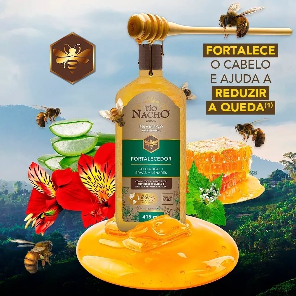 O Shampoo Tio Nacho Ervas Milenares combina uma série de extratos de origens naturais, que nutrem e fortalecem a raiz do cabelo, limpando profundamente o folículo capilar e eliminando o excesso de oleosidade no couro cabeludo. Com seu poder de revigorar os fios, revitaliza o cabelo fraco em situações de queda, devido à quebra Modo de Uso Aplique o produto sobre o cabelo molhado, distribuindo generosamente fazendo uma leve massagem no couro cabeludo Enxágue Para melhores resultado repita a operação Benefícios Revitaliza o couro cabeludo Fortalece e regenera o cabelo Estimula o fio Hidrata, suaviza e dá brilho Oferece ação umectante e previne a queda do cabelo Regula a secreção sebácea