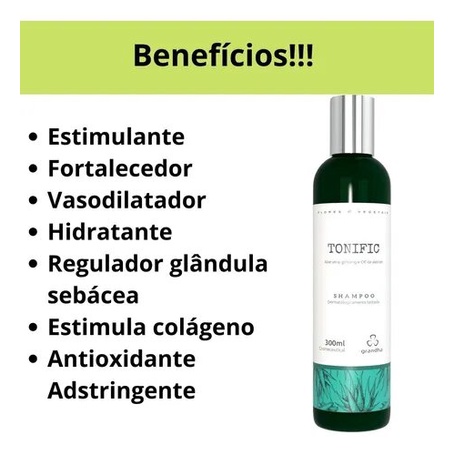 Grandha Tonific Shampoo - 300ml O kit Tonific, da linha de terapia capilar, Flores e Vegetais, é a clássica associação dos extratos concentrados de aloe vera e ginseng, com um toque de óleo essencial de alecrim para tonificar e fortalecer os cabelos. O Tonific Shampoo é especialmente utilizado na tonificação e fortalecimento dos cabelos. Ideal para ser usado em conjunto com o Kit Tonific Flores & Vegetais. SHAMPOO FITO TERAPÊUTICO DE USO DIÁRIO COM ÓLEOS ESSENCIAIS DESENVOLVIDO PARA ESTIMULAR O COURO CABELUDO E TRATAR QUEDA, CABELOS FRACOS E QUEBRADIÇOS E OLEOSIDADE EXCESSIVA. Indicado para: • Alopecia • Eflúvio Telógeno • Queda de cabelos • Oleosidade excessiva • Baixo crescimento dos fios • Cabelos fracos Ação do produto: • Estimulante • Fortalecedor • Vasodilatador • Hidratante • Regulador glândula sebácea • Estimula colágeno • Antioxidante Adstringente Conselho de Aplicação: Aplique o Tonific Shampoo nos cabelos previamente molhados, massageie abundantemente e enxágue. Repita a operação e aproveite ao máximo o efeito hidratante da espuma. Enxágue os cabelos. Contém: 01- GRANDHA TONIFIC SHAMPOO - 300ml Quem somos : A Locus é uma loja online, que oferece produtos nacionais e importados no Brasil. , temos orgulho desse sucesso e hoje conquistamos clientes em todo o Brasil, o resultado para nosso sucesso é simples, entregamos exatamente o que prometemos para atender todas as expectativas dos nossos clientes. Servir bem, para servir sempre. Obrigada!!!