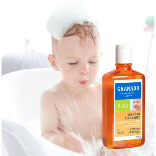 Shampoo Granado Bebê Camomila 250ml. Fórmula suave e hipoalergênica, limpa delicadamente os fios e o couro cabeludo do bebê. Enriquecido com extrato de camomila, acalma e perfuma suavemente. Não irrita os olhos. Ideal para uso diário.