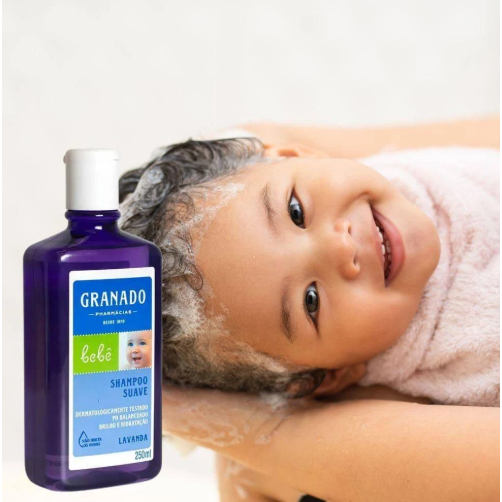 Shampoo Granado Bebê Lavanda 250ml. Fórmula suave e hipoalergênica, limpa delicadamente os fios e o couro cabeludo do bebê. Com fragrância calmante de lavanda, não irrita os olhos e pode ser usado diariamente. Testado por dermatologistas e pediatras.