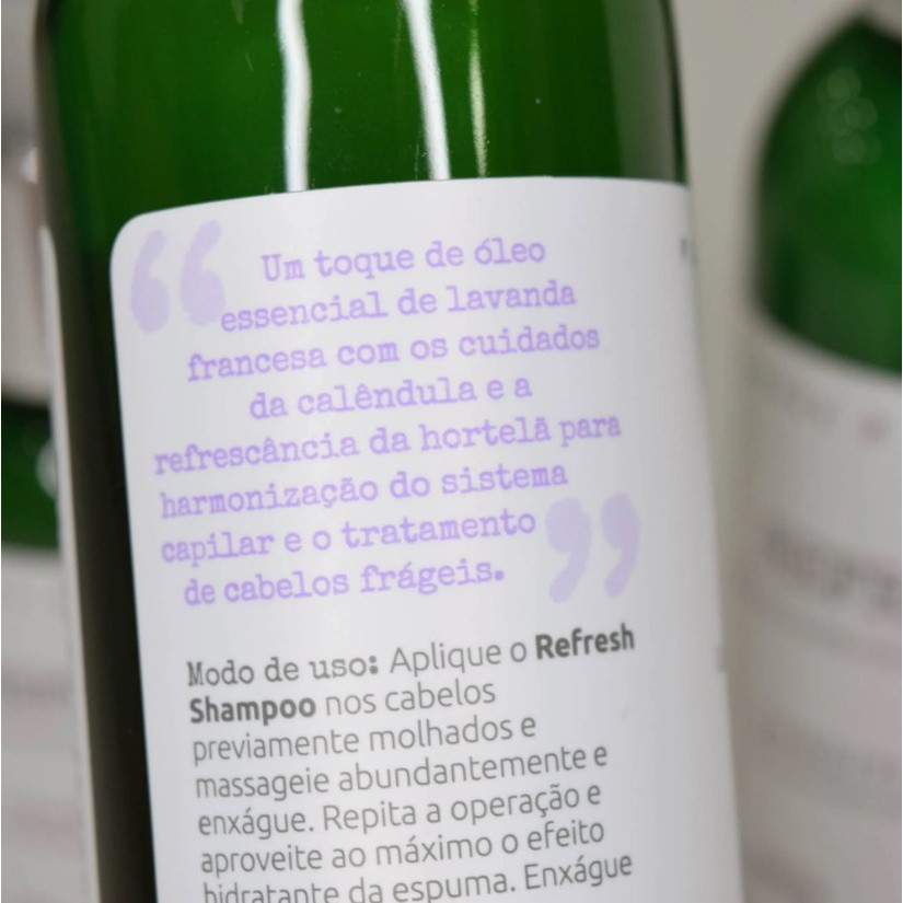 Descrio: Refresh Shampoo Grandha Flores e Vegetais 300ml O Refresh Shampoo traz um blend que harmoniza o sistema capilar, tratando os cabelos frgeis e refrescando o couro cabeludo. Ideal para ser usado em conjunto com o Kit Refresh Flores & Vegetais. Da linha de terapia capilar, Flores e Vegetais, combina um toque de leo essencial de lavanda com os cuidados da calndula e o frescor da hortel para a harmonizao do sistema capilar e o tratamento de cabelos frgeis. Refresh Shampoo 300ml Principais Ativos - Calndula - Hortel - Lavanda Francesa leo Essencial de Lavanda O leo essencial de lavanda francesa o mais conhecido, consumido e tradicional dentre todos. A lavanda acalma, tranquiliza e combate o estresse. Bastante indicado para terapias capilares, por sua ao calmante e cicatrizante. Atua diretamente no relaxamento do sistema nervoso e muscular. Proporciona alvio e descanso. Aut. Funcion. M.S.: 2.05306.7 Proc. N 25351.852597/2016-50 Especificações Técnicas: Contém 01 - Refresh Shampoo Grandha Flores e Vegetais 300ml