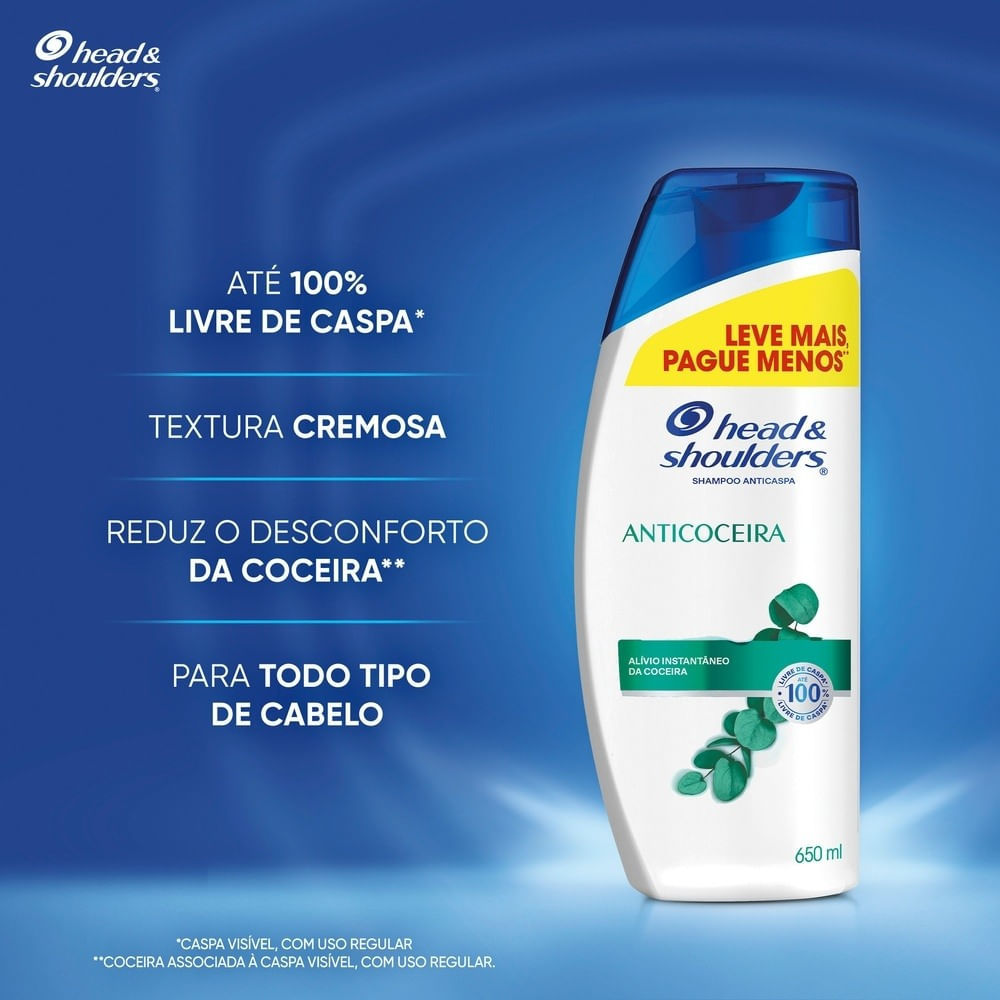 O Shampoo Head & Shoulders Anticoceira alivia instantâneamente a coceira e elimina até 100% as caspas e impurezas* do couro cabeludo. Sua fórmula com pH balanceado, é efetiva contra caspa e impurezas*