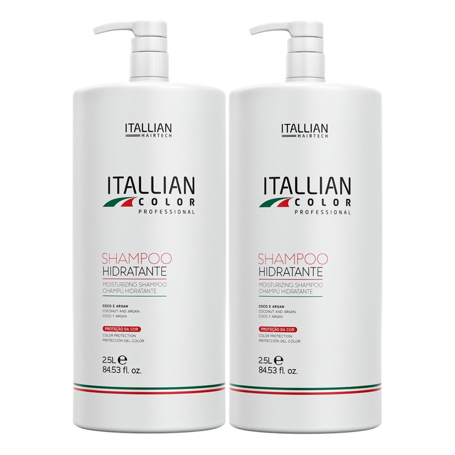 Shampoo Hidratante Itallian Color de 2.5 litros para lavatórios, rende mais de 180 aplicações. Proporciona a limpeza e a hidratação dos fios. Além disso, promove emoliência, força, brilho e movimento aos cabelos. Oferece tecnologia exclusiva de proteção da cor a partir de um componente 100% vegetal com cera de arroz, ésteres de jojoba e óleo de girassol que garantem uma cor mais intensa e duradora. A concentração dessas substâncias protege os fios contra o ressecamento, promove nutrição avançada das camadas mais profundas da fibra capilar e atua no controle do frizz.