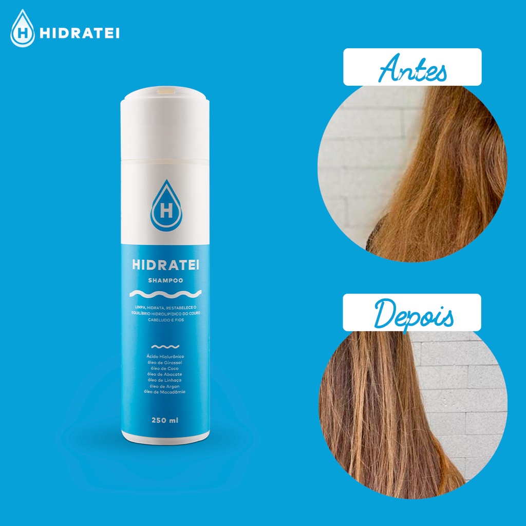 O que é Shampoo Hidratei? O Shampoo Hidratei é o shampoo perfeito para todo o tipo de cabelo. Ele fornece o cuidado perfeito para os seus fios. Hidrata e limpa na medida certa. Possui em sua composição ácido hialurônico, blend de óleos poderosos e pantenol que evitam danos causados pela lavagem. Assim você terá um couro cabeludo mais saudável e cabelos macios, hidratados e protegidos. O que só ele faz: Protege o cabelo dos danos causados pela lavagem Ação Antiqueda Purifica o couro cabeludo Restabelece o equilíbrio hidrolipídico do couro cabeludo e fios Livre de Parabenos e Petrolatos Produto Vegano Qual o diferencial do Shampoo Hidratei?: O Shampoo Hidratei foi formulado com o objetivo de limpar seu cabelo e couro cabeludo sem agredi-los. Ele possui: Ácido hialurônico, que cuida do seu couro cabeludo ao mesmo tempo que hidrata seus fios. Blend de óleos (coco, abacate, girassol, argan, linhaça, alecrim) que é ideal para couro cabeludo sensível, pois hidrata, protege, purifica e ainda tem ação antiqueda. Pantenol que melhora a textura do cabelo que foi danificado fisicamente ou por tratamento químico, aumenta o corpo do fio, melhora sua elasticidade e hidrata sem pesar. Assim você terá um couro cabeludo mais saudável e cabelos macios, hidratados e protegidos. Como age em cada cabelo: O Shampoo Hidratei é perfeito para todo o tipo de cabelo. Ele fornece o cuidado perfeito para os seus fios. Hidrata e limpa na medida certa. O Shampoo Hidratei possui ácido hialurônico, blend de óleos poderosos e pantenol que evitam danos causados pela lavagem. O que os especialistas dizem?: O Shampoo Hidratei é um produto dermatologicamente testado e desenvolvido especialmente para o cabelo e couro cabeludo. Produto Notificado pela Anvisa, não testado em animais e livre de parabenos e petrolatos Porque você deveria usar: Hidrata e limpa na medida certa. Possui em sua composição ácido hialurônico, blend de óleos poderosos e pantenol que evitam danos causados pela lavagem. Hidrata, dá brilho, recupera o fio danificado e cuida do couro cabeludo. Como Usar o Shampoo Hidratei? Aplique o shampoo nas mão e em seguida no couro cabelo molhado. Massageie e deixe agir por 2 minutos. Em seguida enxágue e aplique o Spray Multifuncional Hidratei.