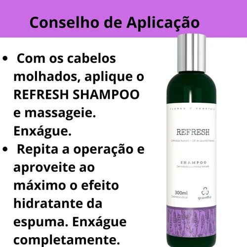 O Shampoo Hidratante Refresh 300ml Grandha traz um blend que harmoniza o sistema capilar, tratando os cabelos frágeis e refrescando o couro cabeludo. Ideal para ser usado em conjunto com o Kit Refresh Flores & Vegetais. Refresh Flores & Vegetais O kit Refresh, da linha de terapia capilar, Flores e Vegetais, combina um toque de óleo essencial de lavanda com os cuidados da calêndula e a refrescância da hortelã para a harmonização do sistema capilar e o tratamento de cabelos frágeis. Harmonização do sistema capilar para cabelos frágeis e o couro cabeludo debilitado ou excessivamente oleoso Conselho de Aplicação Com os cabelos molhados, aplique o REFRESH SHAMPOO e massageie. Enxágue. Repita a operação e aproveite ao máximo o efeito hidratante da espuma. Enxágue completamente. Descrição do Produto Refresh Shampoo 300ml Principais Ativos Calêndula Hortelã Lavanda Quem somos : A Locus é uma loja online, que oferece produtos nacionais e importados no Brasil. , temos orgulho desse sucesso e hoje conquistamos clientes em todo o Brasil, o resultado para nosso sucesso é simples, entregamos exatamente o que prometemos para atender todas as expectativas dos nossos clientes. Servir bem, para servir sempre. Obrigada!!!