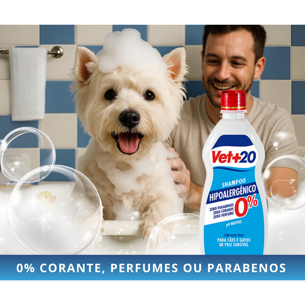 Feito com matéria-prima importada, o shampoo Vet+20 Premium é o único shampoo premium do mercado pet e proporciona maior poder de limpeza. Indicado para cães e gatos, a partir de 2 meses de idade, que tenham a pele facilmente irritável. O shampoo hipoalergênico é ZERO%: não contém parabenos, não contém perfume e não contém corante. Com extrato de camomila, limpa profundamente sem agredir a pele. Modo de usar: molhe totalmente o pelo do animal e aplique o shampoo em quantidade suficiente para fazer espuma. Massageie bem. Deixe agir por 5 minutos e enxágue. Se necessário repita a aplicação e enxágue cuidadosamente.