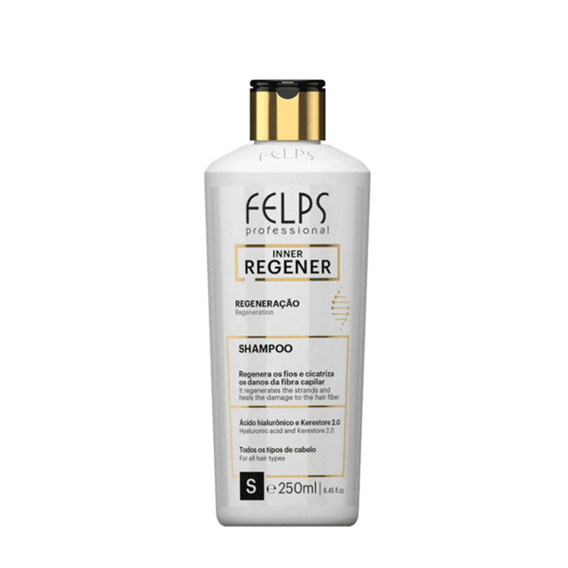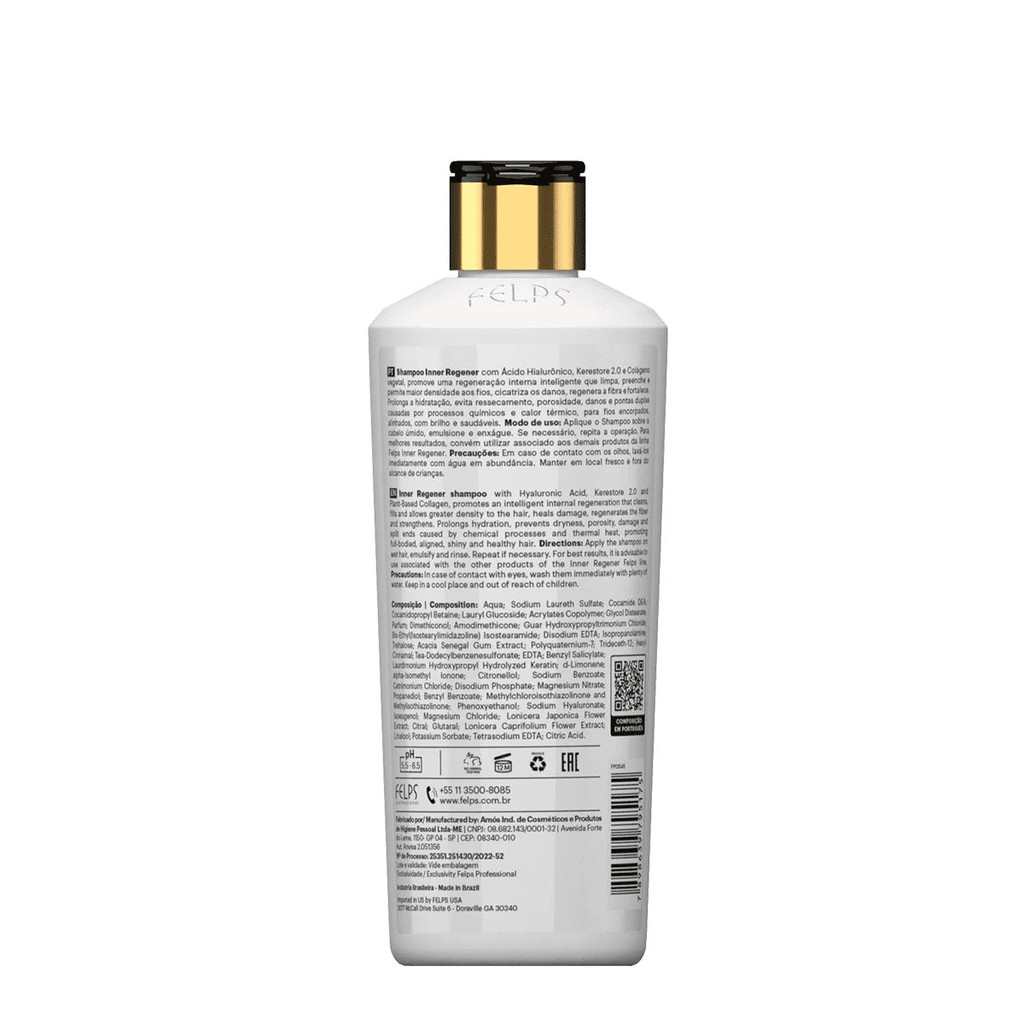 Shampoo Inner Regener 250ml - Felps Sobre o produto: Shampoo para todos os tipos de cabelo. Felps Professional Inner Regener limpa, promove a regeneração, fortalecimento e preenchimento da fibra capilar, densifica e fortalece o fio. O Shampoo Felps Professional Inner Regener prolonga a hidratação dos cabelos, impede o ressecamento, porosidade, danos e pontas duplas causadas por calor térmico e processos químicos. Garante fios mais encorpados e com brilho. Modo de Usar: Aplique o shampoo sobre o cabelo úmido, emulsione e enxágue. Se necessário, repita a operação. Ingredientes: Água; Lauriletersulfato de Sódio; Dietanolamina Cocamida; Cocoamidopropilbetaína; Lauril Glicosídeo; Copolímero de Ácido Metacrílico e Acrilato de Etila; Diestearato de Etilenoglicol; Perfume; Dimeticonol; Amodimeticona; Cloreto de Goma Guar Hidroxipropiltrimônio; Bis-Etil(Isostearilimidazolina) Isostearamida; Edetato Dissódico; Isopropanolamina; Trealose; Extrato da Goma de Acacia Senegal; Poliquatérnio-7; Polietilenoglicol-12 Éter de Álcool Tridecílico; Hexil Cinamal; Dodecilbenzenosulfonato de Trietanolamina; Ácido Edético; Salicilato de Benzila; Queratina Hidrolisada de Hidroxipropil Laurdimônio; Dextrolimoneno; alfa-Isometil Ionona; Citronelol; Benzoato de Sódio; Cloreto de Cetrimônio; Fosfato de Sódio Dibásico; Nitrato de Magnésio; Propanodiol; Benzoato de Benzila; Metilcloroisotiazolinona e Metilisotiazolinona; Fenoxietanol; Hialuronato de Sódio; Isoeugenol; Cloreto de Magnésio; Extrato da Flor de Lonicera Japonica; Citral; Glutaral; Extrato da Flor de Lonicera Caprifolium; Linalol; Sorbato de Potássio; Edetato de Sódio; Ácido Cítrico.