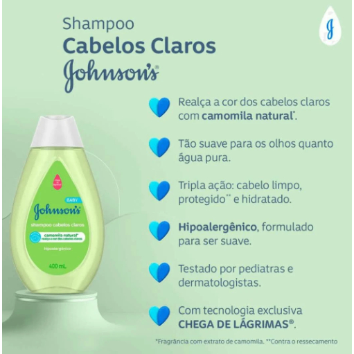 Shampoo Johnson's Baby Cabelos Claros 200ml. Fórmula suave e hipoalergênica, realça o brilho natural dos fios claros. Com camomila, limpa delicadamente sem arder os olhos. Ideal para uso diário em bebês e crianças com cabelos claros.