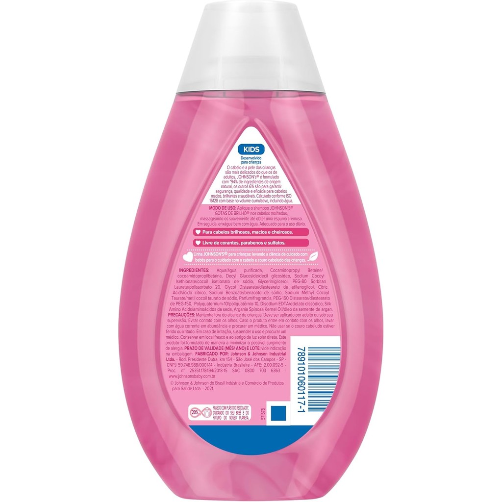 Shampoo infantil. Johnson's Baby Gotas de Brilho proporciona brilho e maciez, para que o cabelinho do bebê fique ainda mais bonito e saudável. O Shampoo Johnson's Baby Gotas de Brilho possui fórmula inovadora, com Óleo de Argan e Proteínas da Seda, além de contar com a exclusiva fórmula "Chega de Lágrimas" permite uma experiência sem choro, por ser suave aos olhos. Sua fórmula também é anti-frizz e tem pH balanceado, com uma fragrância sofisticada. À medida que seu filho cresce, as necessidades do seu cabelo mudam. O Shampoo Johnson's® Gotas de Brilho possui uma fórmula inovadora com óleo de argan e proteínas da seda, deixando os cabelos macios, brilhantes e saudáveis. Dermatologicamente testada e hipoalergênico. Livre de corantes, parabenos, ftalatos e sulfato.