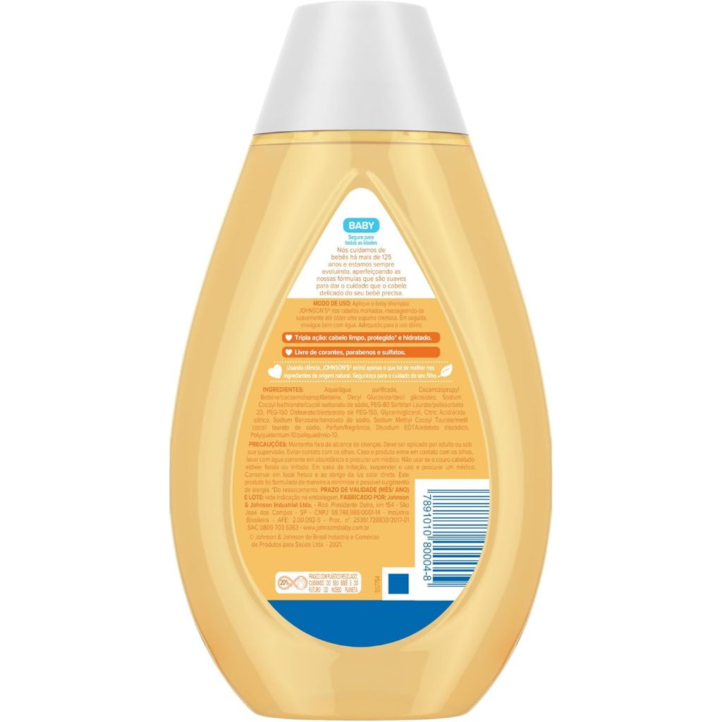 Shampoo Johnson’s Baby Glicerina 400ml Principais Características: • Fórmula enriquecida com glicerina vegetal, que ajuda a manter a hidratação natural dos cabelos. • Tecnologia Chega de Lágrimas, que não arde os olhos e proporciona um banho mais seguro e confortável. • Produto hipoalergênico e testado dermatologicamente, ideal para uso diário em bebês desde o nascimento. Benefícios: • Limpa suavemente o couro cabeludo e os fios, respeitando a delicadeza da pele do bebê. • Ajuda a manter os cabelos macios, sedosos e saudáveis. • Proporciona um perfume suave e agradável após o uso. • Pode ser utilizado por toda a família. Diferenciais do Produto: • Preserva a hidratação natural dos cabelos com o uso da glicerina, um ativo reconhecido por sua ação emoliente. • Não contém sulfatos, parabenos, corantes nem ftalatos. • Desenvolvido especialmente para a pele sensível do bebê, com aprovação de oftalmologistas e pediatras. Especificações Técnicas: • Peso: 400ml Instruções de Uso: • Aplique o shampoo nos cabelos molhados do bebê. • Massageie suavemente até formar espuma. • Enxágue completamente com água morna. • Pode ser usado diariamente. Avisos e Precauções: • Uso externo. • Manter fora do alcance de crianças. • Em caso de irritação, suspenda o uso e procure orientação médica. • Evite contato direto com os olhos. Se isso ocorrer, enxágue com água em abundância. O que está incluso? • 1 unidade de Shampoo Johnson’s Baby Glicerina 400ml ---- DÚVIDAS FREQUENTES ---- Os produtos são originais? Sim. Todos os nossos produtos são originais. Emitem nota fiscal? Sim. Emitimos nota fiscal para todos os pedidos.