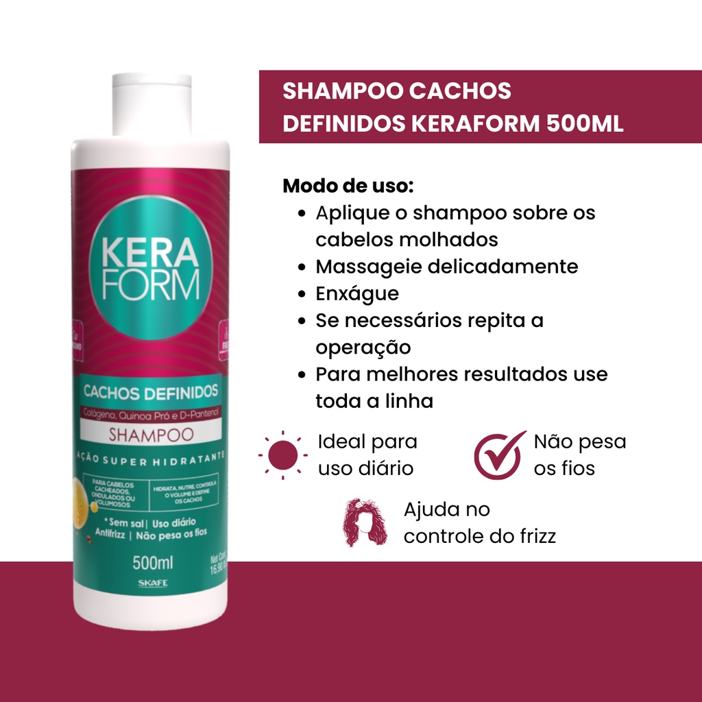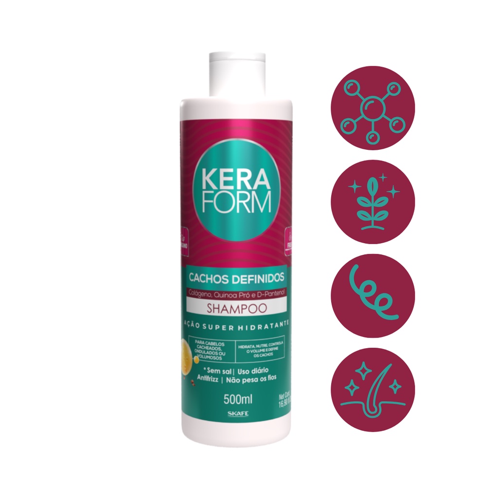 Cachos lindos como você sempre quis! Agora é possível ter cabelos Mega Hidratados e com Nutrição Máxima. Um tratamento de Salão dentro da sua Casa! Super hidratação sem efeito molhado. O Shampoo Keraform Cachos Definidos limpa de maneira natural, hidrata e nutre profundamente. Controla o volume e define os cachos, deixando-os ultra sedosos, com balanço e cheios de vida. INDICADO PARA CABELOS CACHEADOS, ONDULADOS OU VOLUMOSOS. Ativos: - Quinoa Pró - Colágeno – É responsável pela elasticidade e força dos fios, rejuvenesce, proporcionando o crescimento normal e saudável. Deixando os cabelos mais brilhosos, macios, resistente, com elasticidades e flexibilidades dos fios. - D-Pantenol A Skafe vem construindo sua história no mercado de cosméticos há 37 anos, tendo a inovação, a tecnologia e a pesquisa como aliadas. Nossos produtos são elaborados por especialistas que tem como missão o desenvolvimento ético e responsável, a fim de proporcionar beleza e bem-estar com alta qualidade, eficácia e segurança. Nossas linhas atendem a diversos estilos e tipos de cabelos, tanto no Brasil como no Mercado Internacional.