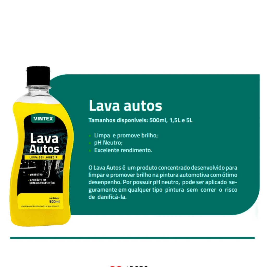 LAVA AUTOS 500ML VINTEX DESCRIÇÃO: O Lava Autos é um produto que foi desenvolvido para limpar, proteger e conservar a lataria do veículo. Por possuir pH neutro, pode ser aplicado em qualquer superfície sem correr o risco de danificá-la. MODO DE USO: 1. Dilua o produto na concentração de 100ml para cada 5L de água e, com o auxílio de uma luva de microfibra, comece a lavar o veículo pelas partes mais altas e depois as mais baixas 2. Enxágue em seguida até remover toda a espuma 3. Para melhor resultado, seque o veículo com toalha de secagem