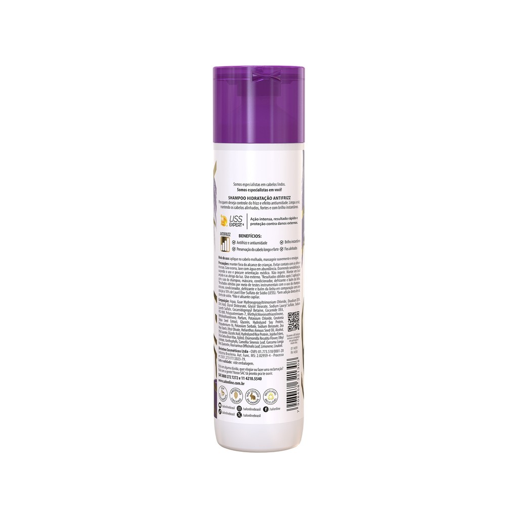 O Shampoo Meu Liso Antifrizz é ideal para quem deseja controle do frizz e ação antiumidade por até 72h. Limpa a raiz, mantendo os cabelos alinhados, fortes e com brilho instantâneo. <>INDICAÇÕES$& Para quais tipos de cabelo? Cabelos lisos naturais, alisados ou relaxados. Qual a indicação? Cabelos com frizz, ressecados ou quebradiços. Pode usar a partir de quantos anos? A partir de 12 anos. <>ATIVOS$& Quais os principais ativos? O Shampoo Meu Liso Antifrizz conta com a tecnologia exclusiva Liss Expert que garante ação intensa, resultado rápido e proteção contra danos externos. <>MODO DE USO$& Qual a melhor forma de usar? Aplique no cabelo molhado, massageie suavemente e enxágue. <>CARACTERÍSTICAS$& É produto vegano? O produto é vegano. É liberado? O produto não é liberado.