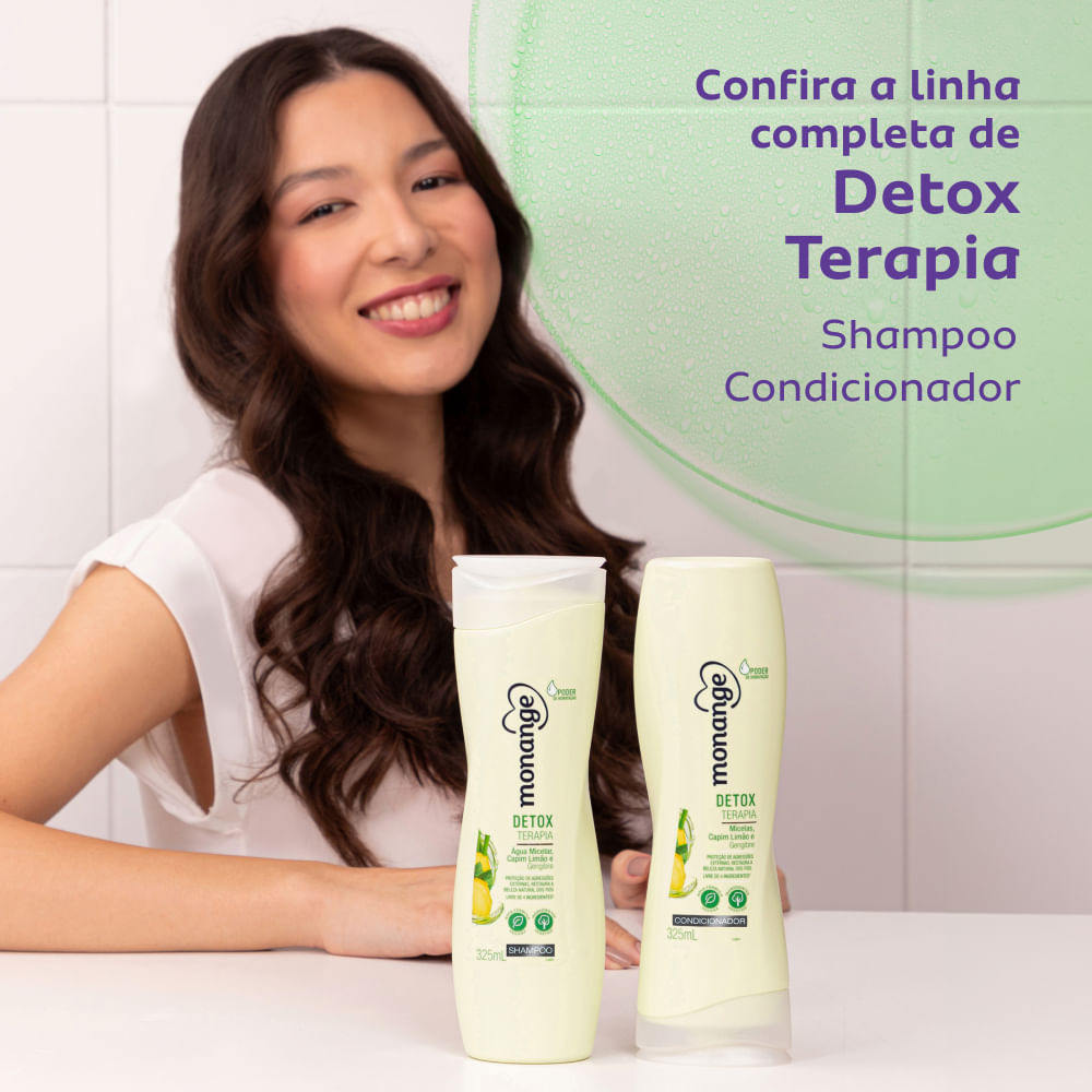O Shampoo Monange Detox Terapia 325ml é ideal para manter os fios limpos e hidratados. Sua fórmula com menta, gengibre e capim-limão equilibra a oleosidade e suaviza as agressões externas, desintoxicando os fios para restaurar a beleza e estimular você a ouvir o coração em sua forma mais pura. Com ingredientes naturais auxiliam no fortalecimento dos fios da raiz até às pontas, reduzindo a oleosidade, mantendo os fios resistentes e saudáveis. Benefícios: Limpeza profunda e eficaz, sem ressecar os fios;Remove oleosidade e resíduos acumulados, purificando o couro cabeludo;Com chá verde, gengibre e vitamina E, ativos antioxidantes e revitalizantes;Sensação refrescante e couro cabeludo renovado;Revitaliza e reequilibra os fios da raiz às pontas;Cabelos mais leves, soltos e com brilho natural.*Este produto está sofrendo troca de embalagem, envio conforme disponibilidade de estoque!!!Modo de usar: Aplique o Shampoo nos cabelos molhados, massageando suavemente. Enxágue bem. Se necessário, repita a aplicação.Sobre a marca: Presente no mercado há 52 anos, Monange é uma marca símbolo de tradição no Brasil. Tem como principal preocupação garantir a beleza e entender a mulher brasileira, estando presente no seu dia-a-dia. Desde 1965, a Monange se identifica com a mulher brasileira para entender as suas necessidades e cuidar de cada uma delas. O começo foi com a tradicional linha de hidratantes, que acompanha o cotidiano das consumidoras para proporcionar uma pele macia e perfumada todos os dias.