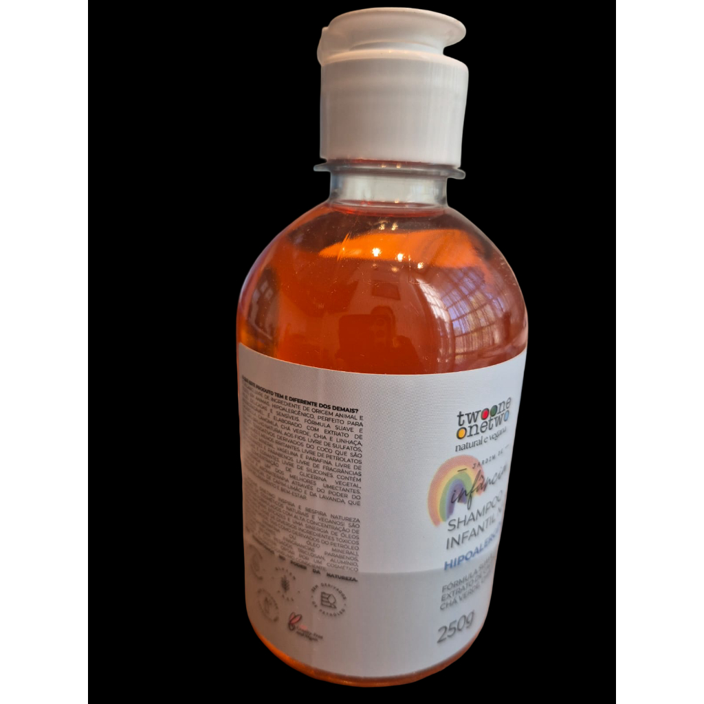 Shampoo Infantil Natural 250g twoone onetwo. Fórmula suave, PH entre 5,0 e 6,0. Com extrato de calêndula, camomila, chá verde, chia e linhaça. Hipoalergênico. Perfeito para peles delicadas e sensíveis. Elaborado com extrato de calêndula, camomila, chá verde, chia e linhaça, que dão brilho natural aos fios. Usamos tensoativos derivados do coco que são mais suaves e menos irritantes. Contém alta concentração de glicerina vegetal, considerada um dos melhores umectantes. Estimula a aromoterapia através do óleo essencial de capim-limão.