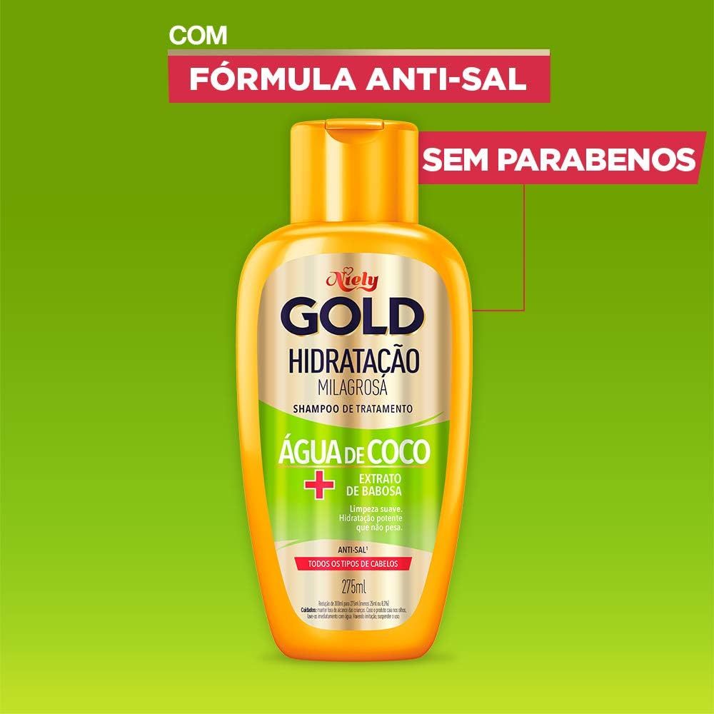 Shampoo Niely Gold Hidratação Milagrosa – 275ml O Shampoo Niely Gold Hidratação Milagrosa foi desenvolvido para proporcionar uma limpeza eficaz e suave, ao mesmo tempo em que hidrata profundamente os fios. Indicado para cabelos secos e ressecados, sua fórmula rica em ingredientes nutritivos promove brilho, maciez e vitalidade logo nas primeiras lavagens, garantindo um cuidado diário com resultado visivelmente saudável. Principais Características Fórmula com Óleo de Coco e Babosa Combina dois ingredientes altamente hidratantes e reparadores: o óleo de coco, que nutre e sela as cutículas, e a babosa, que promove uma hidratação natural e revitaliza os fios. Tecnologia MaxQueratina+ Complexo exclusivo de aminoácidos que reforça a estrutura capilar, restaurando a força e a resistência dos fios fragilizados. Limpeza que respeita a saúde dos fios Remove impurezas sem ressecar, preparando os cabelos para o tratamento completo da linha Hidratação Milagrosa. Benefícios Hidratação profunda e duradoura Restaura o brilho e a maciez dos cabelos secos Reforça a estrutura capilar com MaxQueratina+ Ajuda a reduzir o frizz e o ressecamento Indicado para uso diário Diferenciais do Produto Ativos naturais e eficazes: óleo de coco e babosa juntos para uma hidratação poderosa Tecnologia profissional acessível: resultado de salão em casa com excelente custo-benefício Textura cremosa e fragrância agradável: proporciona uma experiência sensorial agradável durante o uso Especificações Técnicas Peso: 275ml Instruções de Uso Aplique o shampoo nos cabelos molhados, massageando suavemente o couro cabeludo até formar espuma. Enxágue bem. Se necessário, repita a aplicação. Para melhores resultados, utilize a linha completa Niely Gold Hidratação Milagrosa. Avisos e Precauções Uso externo. Evite contato com os olhos. Em caso de contato, enxágue imediatamente com água abundante. Mantenha fora do alcance de crianças. Em caso de irritação, suspenda o uso e procure orientação médica. O que está incluso? 01 Shampoo Niely Gold Hidratação Milagrosa – 275ml ---- DÚVIDAS FREQUENTES ---- Os produtos são originais? Sim. Todos os nossos produtos são originais. Emitem nota fiscal? Sim. Emitimos nota fiscal para todos os pedidos.